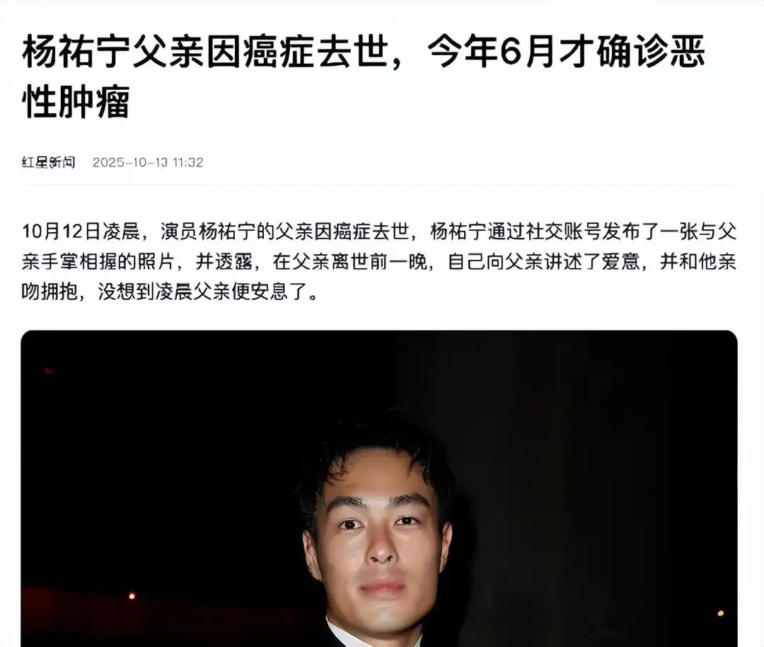 继朱媛媛后,娱乐圈又传噩耗!杨祐宁于10月12日更新动态,晒出家人紧握的手的黑白视频,配文简单却满是心酸,正式官宣父亲离世的消息。此前一晚,他还刚与父亲亲吻拥抱,没曾想离别来得如此突然。 这算是令人猝不及防的悲痛吧!据悉,杨祐宁父亲早在今年6月就被确诊癌症,虽父母曾安慰他不必过度担心,但他始终牵挂,不仅常抽时间去医院陪伴,还晒过陪父亲治疗的照片,努力用乐观心态鼓励父亲。 之前的杨祐宁,刚收获三胎新生儿的喜悦,事业也稳步发展——从早年因星探发掘入圈,历经电影市场的不顺,转战电视剧后凭借《倾世皇妃》《都挺好》等作品打开内地市场,还为贴合观众苦练台词。 现在看来,父亲的突然离世无疑给了他沉重一击。从确诊到离世仅4个月,世事无常让人唏嘘,也希望杨祐宁能早日走出丧父之痛,带着家人的爱继续前行。