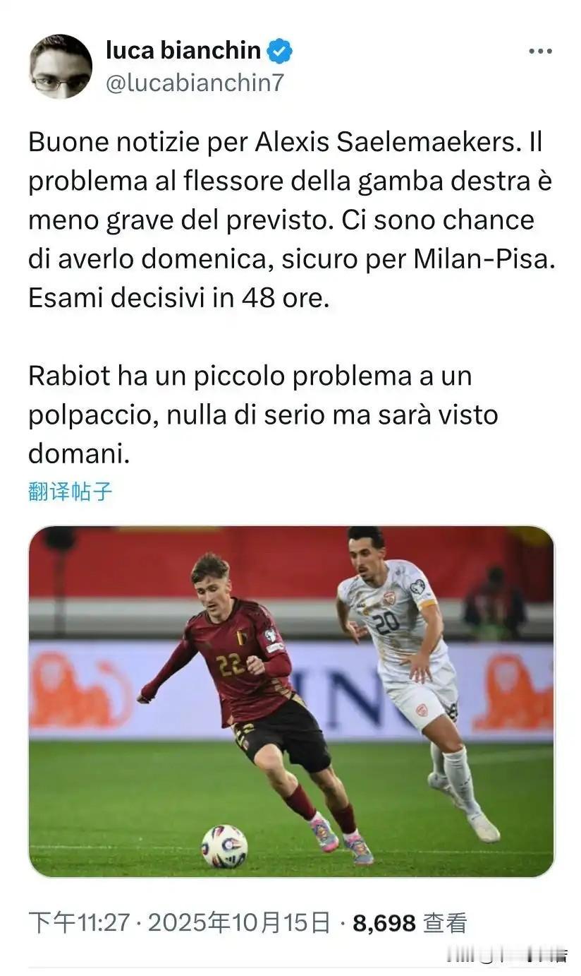 不幸之中的万幸!萨勒马克尔斯二次三次核磁检查结果比之前要乐观的多,他的右腿屈肌问题比预期的要轻。他有可能周日参加米兰与佛罗伦萨比赛,(若周日比赛不上场)肯定能参加米兰对比萨比赛。米兰与比萨之战是25号,米兰就是兽医站,比利时队医之前就说萨勒马克尔斯大概要休息十几天,当时算的就是米兰与比萨萨勒马克尔斯能回来,但回到米兰后核磁检查结果不乐观,说要休息一个月,现在二次结果又变为了无大碍,只能说咱们兽医站水平真的是无语。 同时法国国家队确认拉比奥特的小腿肌肉有点问题,但没什么大碍,明天会进行检测。昨天消息是拉比奥特无大碍,只是肌肉疲劳,今天看确实没啥问题,希望法国国家队能把拉比奥特放在替补席,能不上就别上了,美国国家队那个波切蒂诺缺心眼,德尚看着挺聪明的,别学波切蒂诺。 萨勒马克尔斯对于现在的米兰而言是最重要的存在,因为其他位置多少还有替补球员,萨勒马克尔斯真的没替补。比如美国队长,据说普利西奇伤病不乐观,但普利西奇位置有恩昆库可以替换,作用不会下降多少,萨勒马克尔斯如果上不了,他的替补上来作用与萨勒马克尔斯比就是天壤之别。