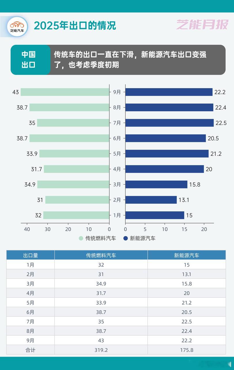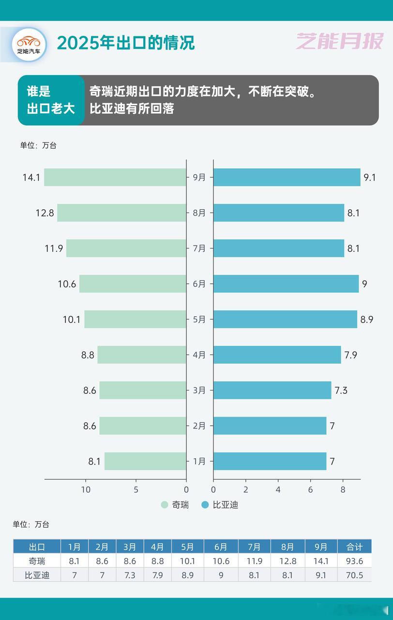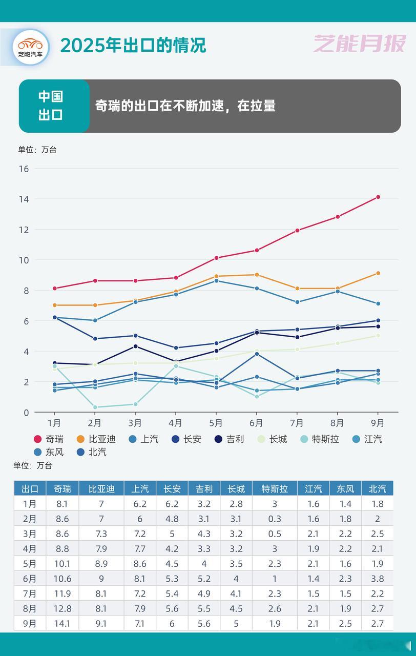 动力类型上,传统车出口基本停滞,新能源成增长主力,同比增长一倍,其中插混车型同比暴涨两倍多,仅 9 月环比略降。企业呈 “三强格局”,奇瑞以显著优势领跑,上汽、比亚迪紧随其后。