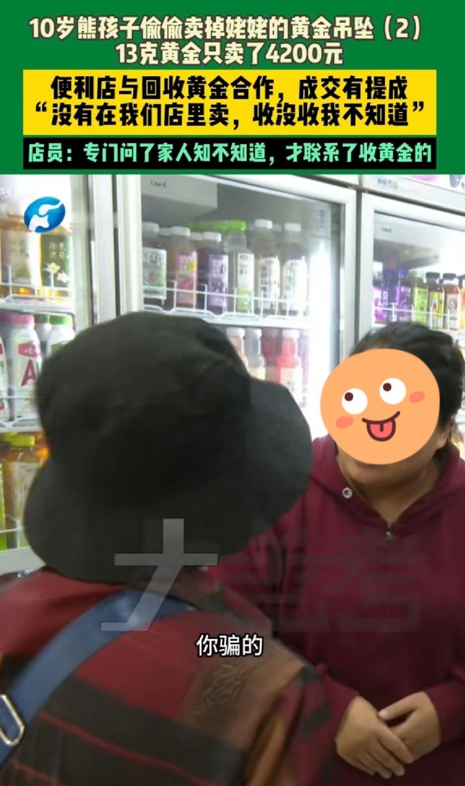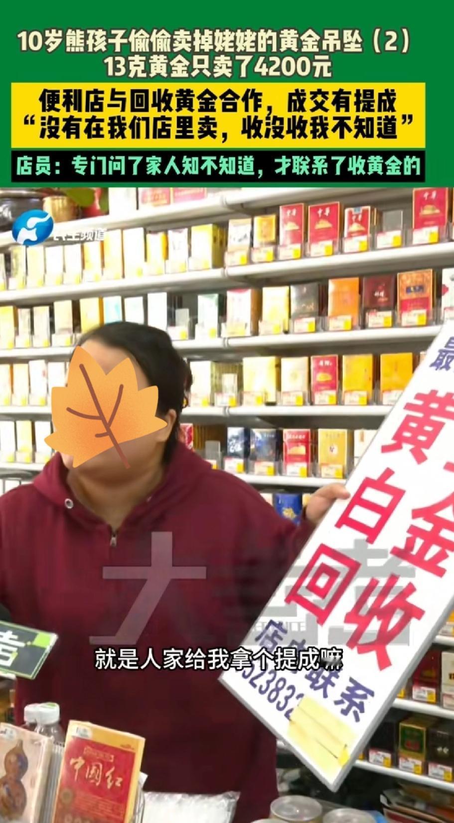 10岁熊孩子偷偷卖掉姥姥13克黄金吊坠,13克黄金只卖了4200元。 姥姥找到便利店老板,老板态度强势,一再反问姥姥谁骗你的黄金了? 姥姥:你骗的! 眼看双方剑拔弩张,记者赶紧上前了解事情的来来龙去脉。 黄金收购牌子放在便利店,每成交一笔,黄金收购的老板便会付给便利店老板相应的提成。 便利店和黄金收购有合作关系,成交后有提成。 店员:专门问了小孩家人知不知道,才联系收了黄金的。 所以才有了开头便利店老板“强势质问当事人的态度”。 便利店老板认为黄金不是自己回收的,出现任何问题跟自己无关。 对于老人说的欺骗自己,便利店老板根本不承认! 看她的态度!认为此事跟自己没有任何关系!反而认为是老人自己没有看好自己的财务,没有管教好自己的孙子。 10岁的孩子偷偷去卖黄金,老板居然叫来的收购黄金的。 现在的金价达到上千元一克,13克黄金居然只值4200元,每克收购定价300元出头,这真是欺负孩子小呀! 明目张胆的骗人家! 黄金交易市场上这个13克的吊坠价值一万多,收黄金的老板花4200元就到手了。 便利店老板和收黄金的老板真是想钱想疯了!面对10岁的孩子卖黄金,一个敢联系,一个就敢就往死里砍价。 事后便利店还盛气凌人的推卸责任! 认为跟自己毫无关系。 人也是你联系的,提成你也拿了,还把自己摘干净了。 这样的孩子也是胆大妄为,这么个年纪,居然偷拿家里的财物出去变卖。 家长存在管教疏忽责任!