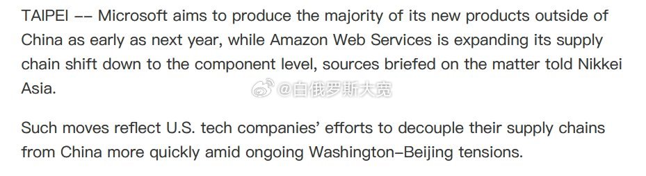 10月16日据《日经亚洲》报道:微软计划最早明年在中国以外生产其大部分新产品。微软已要求多家供应商帮助准备从明年开始将 Surface笔记本电脑和数据中心服务器的生产“移出中国”,包括关键部件和组装。微软要求至少80%的服务器物料清单(BOM)来自中国境外英国制裁11家中国实体