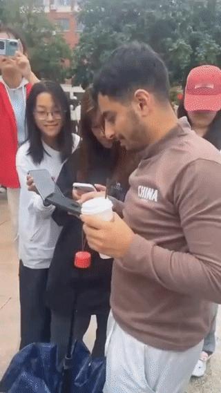 一名外国男子来到一所学校里参观。 当他一出现在校园里,马上就被众多女生围了起来? 女生们都抢着和他搭讪,并主动添加微信好友? 这让男子感到有点受宠若惊啊?社会奇葩事分亨