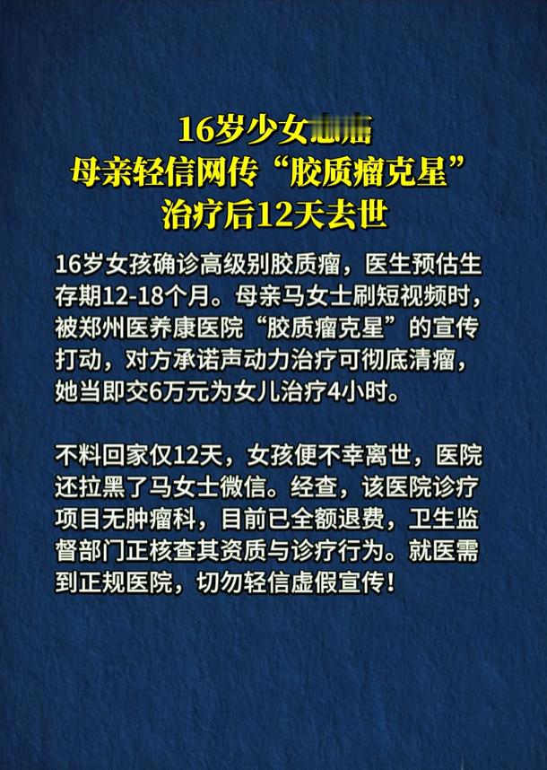 女孩经短视频引流治疗后12天去世 事实证明啥事都得相信正规医院,千万别病急乱投医,父母爱女心切可以理解,但网络这些假宣传太可恨,把钱看的比命还重要,咱就说短视频平台难道就没有责任?强烈呼吁加强审核力度,尤其是保健品,医疗美容,各种治病这类的诈骗广告!