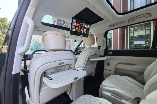 座椅采用真皮打孔材质,支持通风、加热和按摩功能。副驾座椅可一键放倒,配合电动腿托,变成零重力座椅。后排还配备了小桌板,方便办公或就餐。