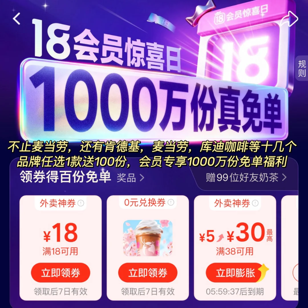 ⭐️这波活动美团真是给力,不止麦当劳,还有肯德基,麦当劳,库迪咖啡等十几个品牌任选1款送100份,会员专享1000万份免单福利