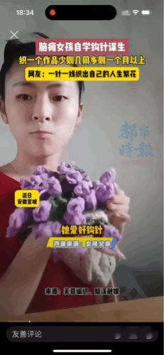 “脑瘫女孩用钩针钩出生命之花”。安徽宣城市郎溪,脑瘫女孩凭着热爱用钩针一针一线织出自己的生命繁花。 小姑娘有个好听的名字,叫蓉蓉。孩子出生时家人看着漂亮的小公主,心里都乐开了花。父母更是对孩子的未来充满了期待。 哪知现实给他们致命的打击。等到1岁以后,他们发现蓉蓉和健康的孩子有点不一样。蓉儿的语言、运动能力比正常的孩子差了好多。一种不祥的预感顿时让父母焦虑不安。 父母很快带着孩子去医院看病,最后被诊断因大脑缺氧而导致脑瘫。听到这个晴天霹雳的消息,父母欲哭无泪。但生活还得继续,父母仍把全心全意的爱给了孩子。 孩子渐渐长大,父亲发现女儿对手工,特别是钩针编织产生了兴趣。他开始在网上买来钩针和线,教女儿编织包包和装饰品。 生活就这样一天一天地过去,他教会了女儿很多,也帮女儿开了直播。直播女儿钩包的视频。 网友们被他女儿的自强不息所打动,纷纷下单购买蓉蓉的手工品。有时没有现货,网友就预定。 蓉蓉爸爸说,他女儿钩完一件作品,少则几天,多则几个月。他们也不催,只是天天鼓励她! 看看视频中纯洁的蓉蓉天真无邪的笑容,看着她用自己的双手努力去撑起自己的未来,我们还有什么理由躺平,还有什么理由报怨呢? 努力吧 取材网络,侵权秒删