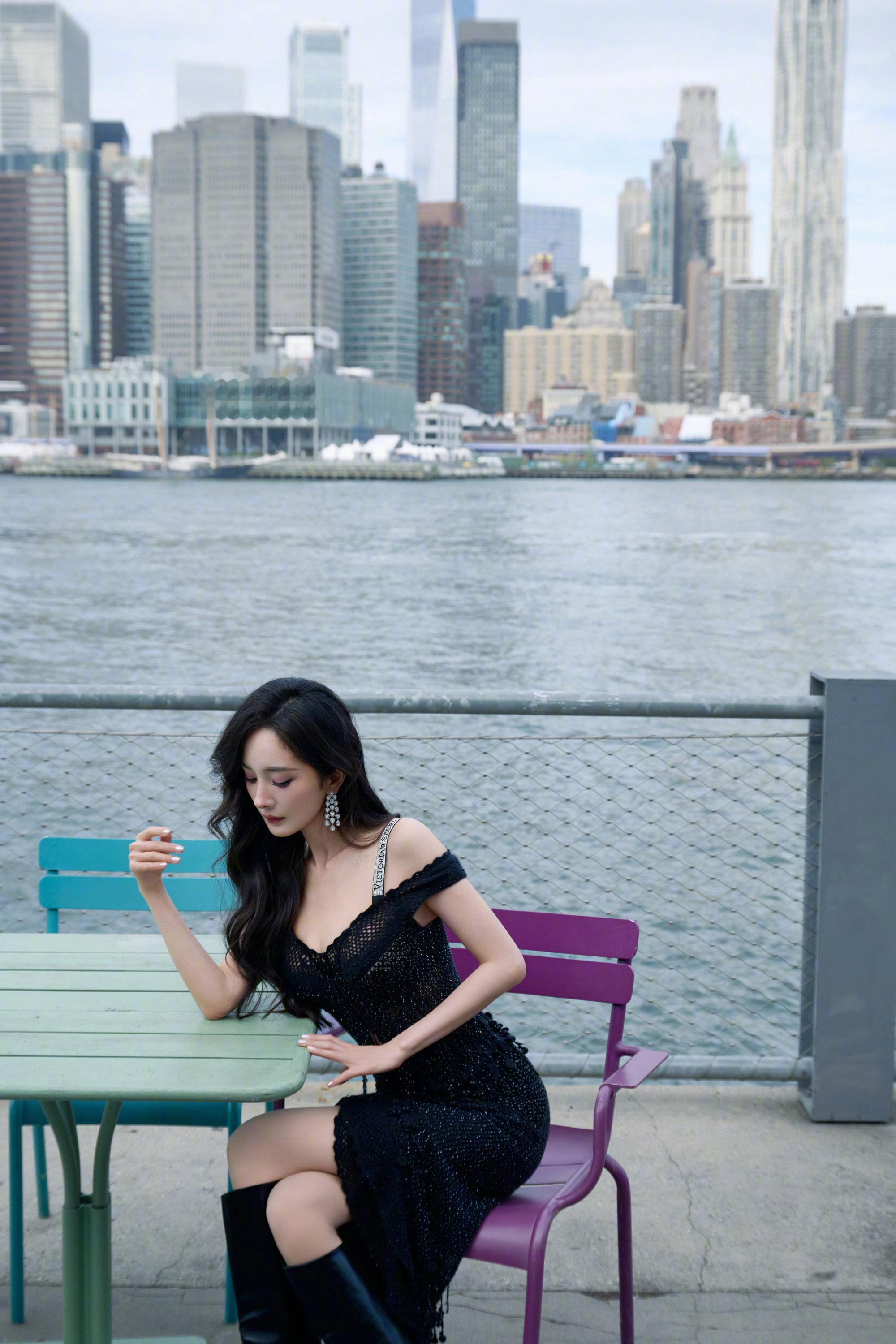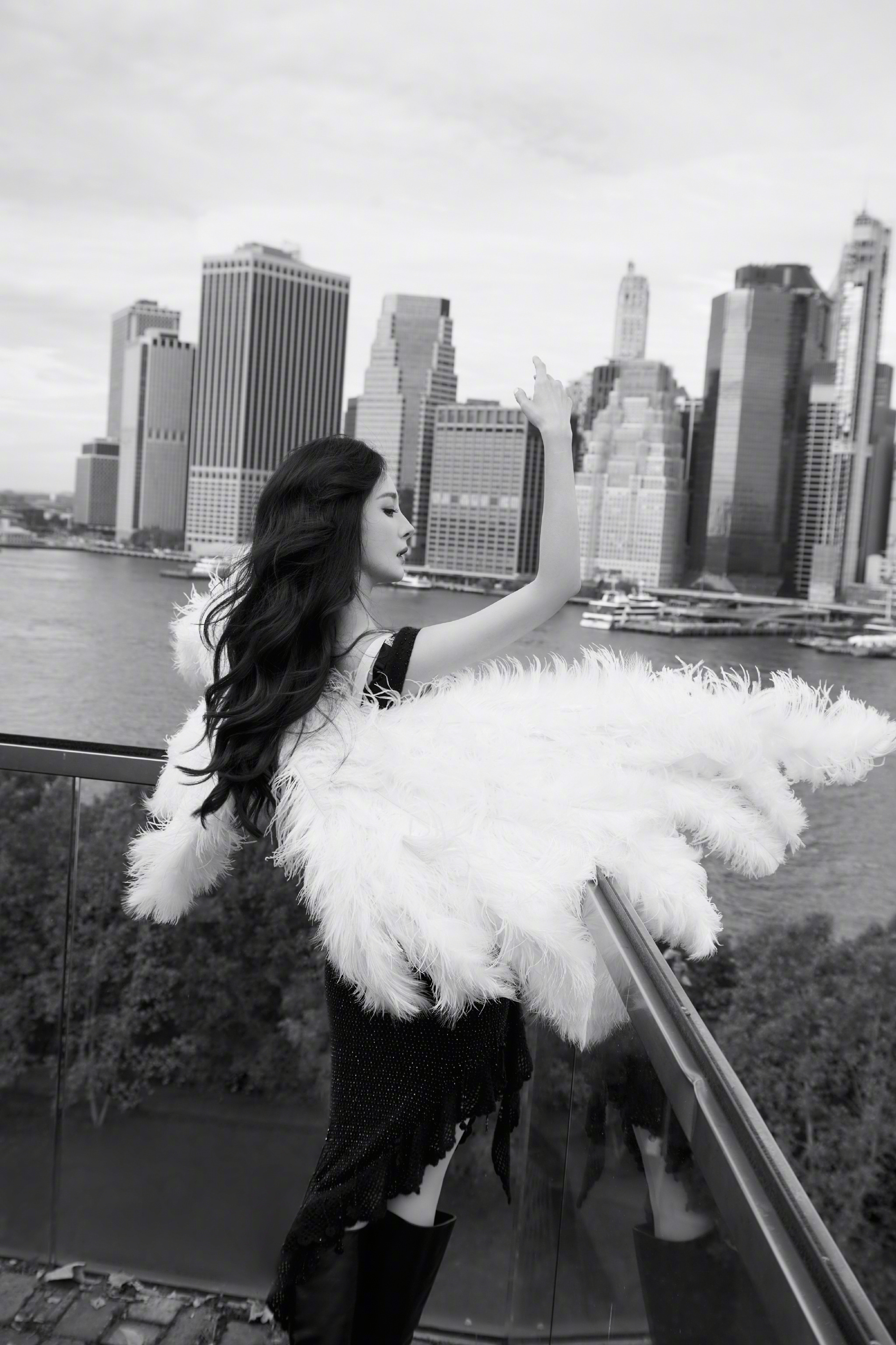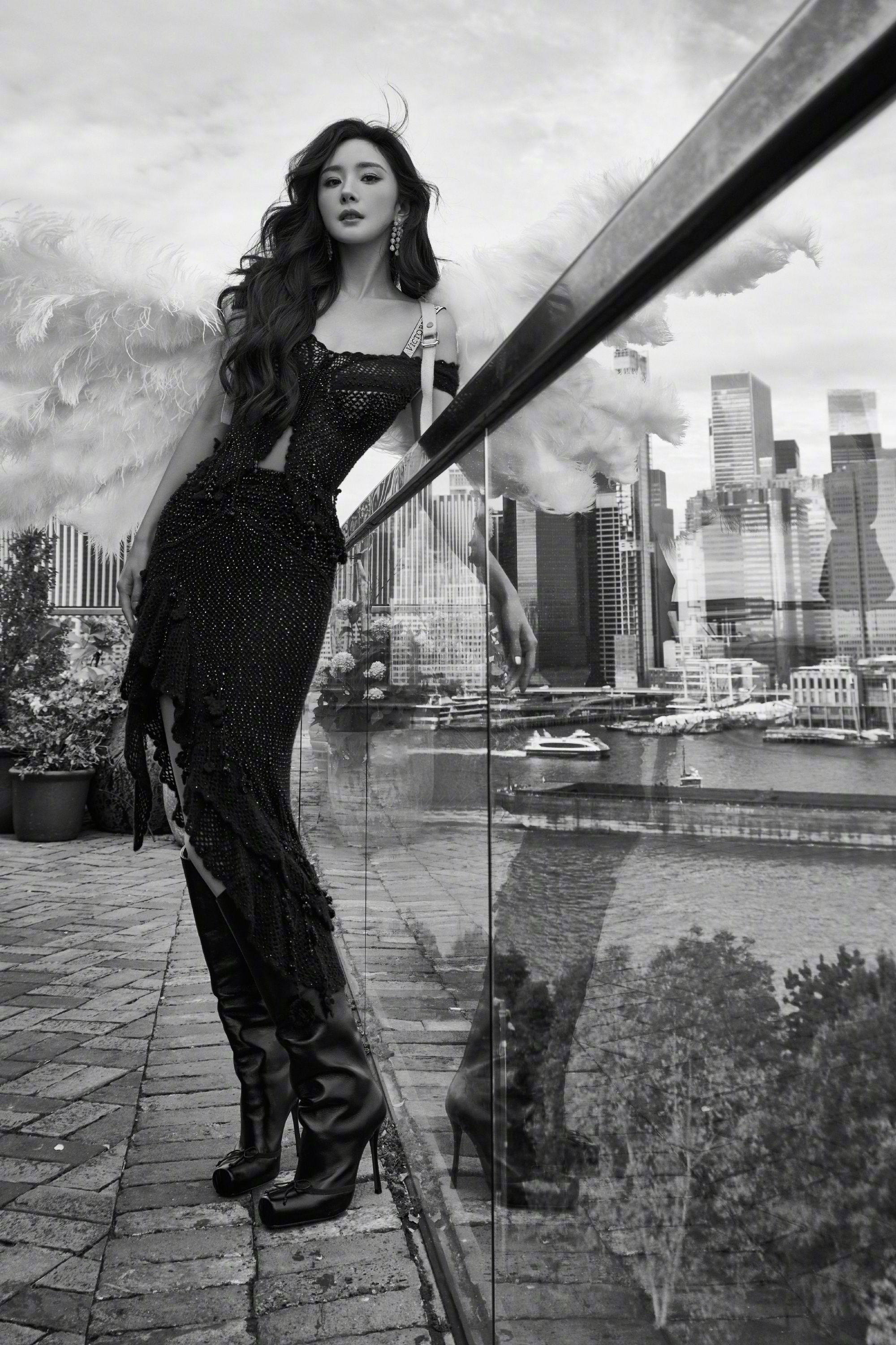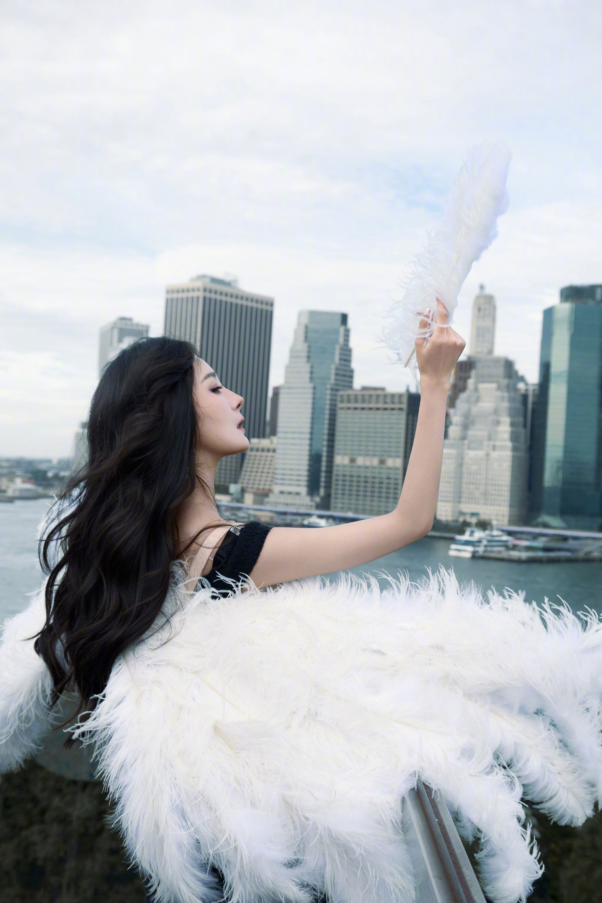 杨幂维密翅膀杨幂这组维密造型太惊艳了!黑色镂空裙搭配纯白羽毛翅膀,在都市背景的衬