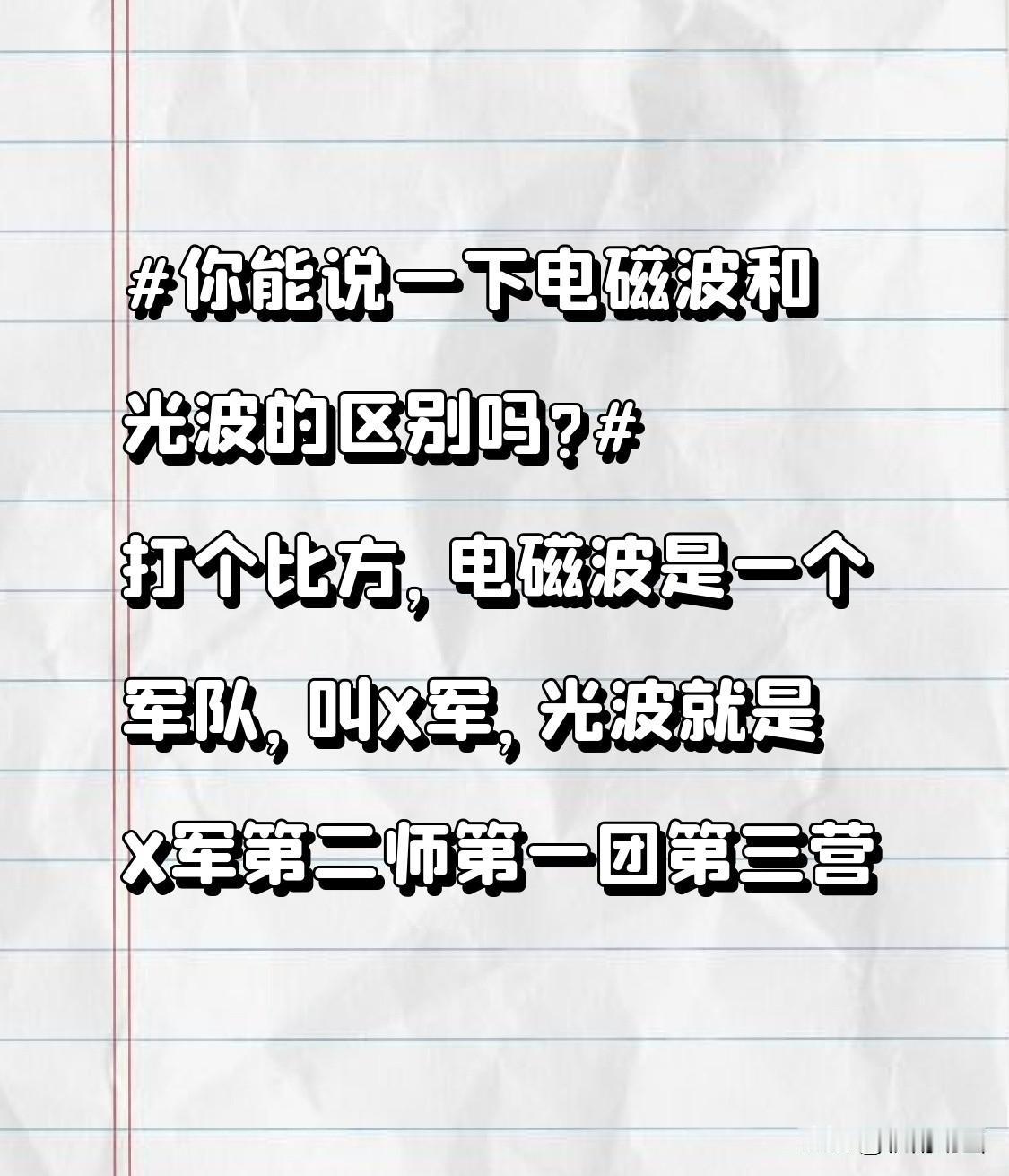 你能说一下电磁波和光波的区别吗?打个比方,电磁波是一个军队,叫X军,光波就是X军第二师第一团第三营