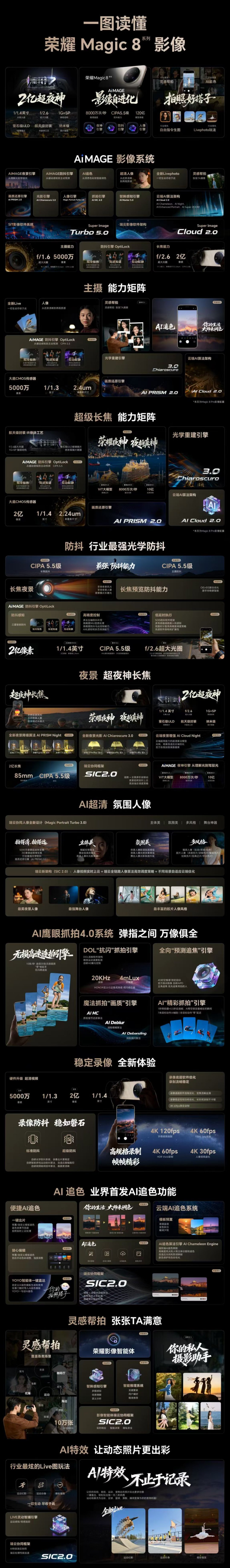 一张图看看昨晚发布的荣耀Mαgic8系列手机影像。真的很震撼,2亿超夜神,影像自进化AI追影像、AI追色、帮拍、特效……