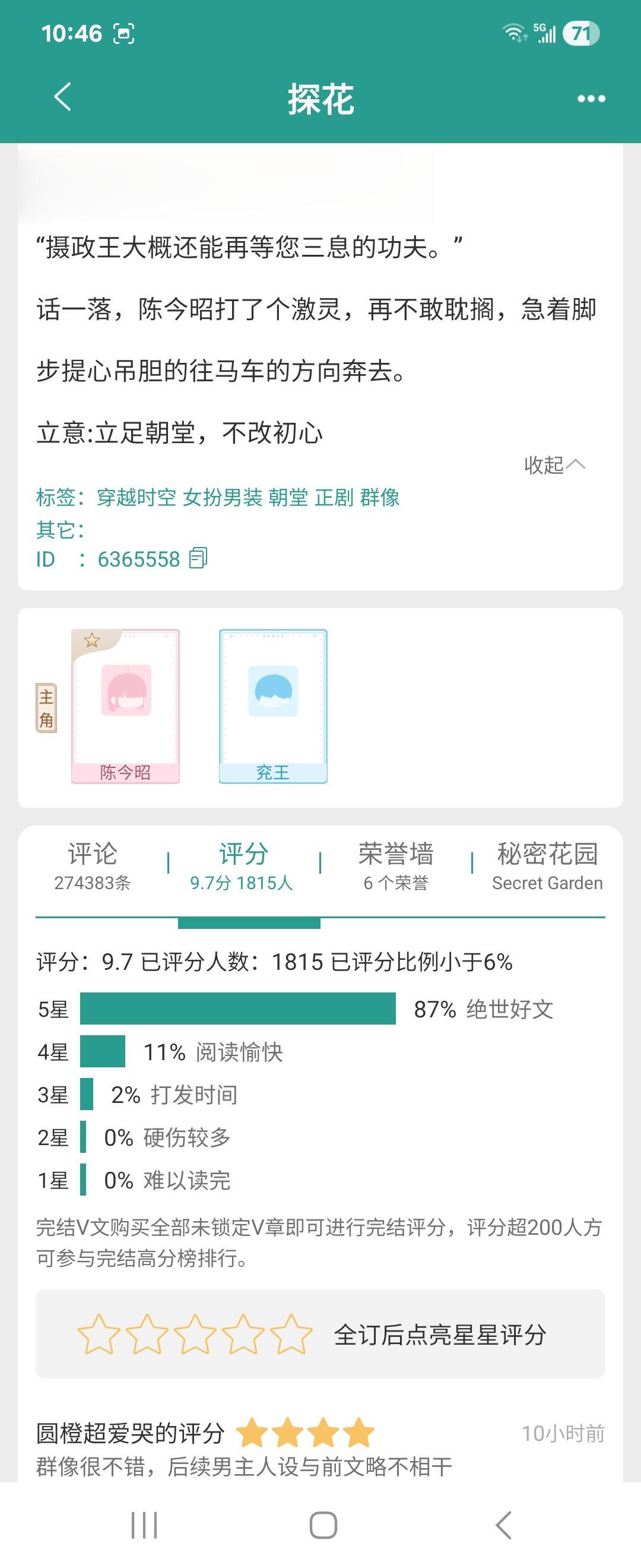 探花。这部小说很好看,作者写的特别逗。女主是女扮男装的探花郎,新朝开年掌管国家的是男主摄政王,他阴晴不定心眼贼多反正性格上有很多缺陷并不完美。在几次接触中男主竟然喜欢上女主,但他不知道是女子啊他就纠结难受差一点就把女主给杀了。小说并不是只讲爱情还讲国家大事,讲女主和朋友同僚为了这个国家做出的很多奉献。前半部分很诙谐有趣,后半部分有些心酸因为男主吃醋啊发疯啊差点崩溃啊。感兴趣的快去看原文超级好看