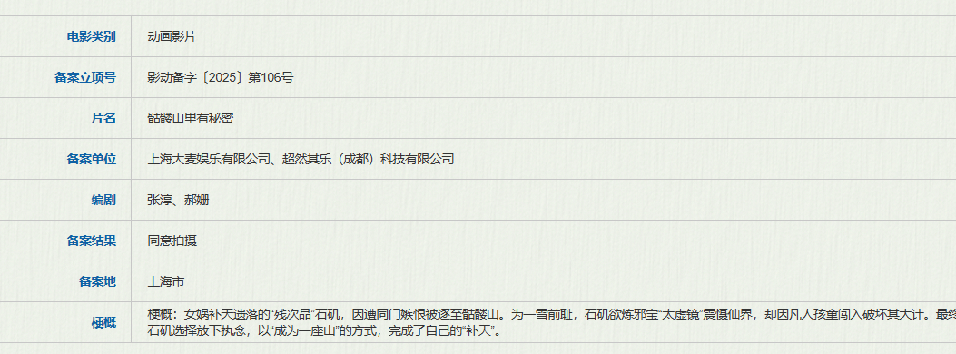 骷髅山里有秘密备案据国家电影局关于2025年9月上全国电影剧本(梗概)备案、立项公示的通知,动画影片《骷髅山里有秘密》立项,编剧为《哪吒之魔童闹海》联合动画导演郝姗、《唐人街探案2》《唐人街探案3》联合编剧张淳。
