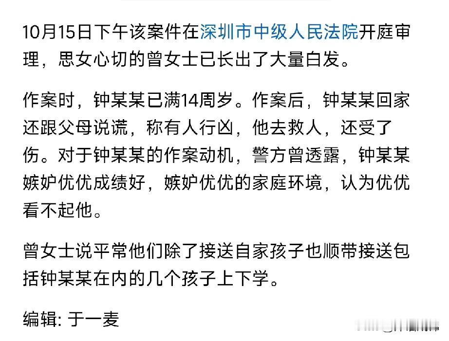 对于14岁的钟某某来说,他被免费接送的三年,每一天都是煎熬! 杀害优优的钟某某,从各方面的表现来看,他是一个内向、自卑、敏感、不善言谈的14岁男生。三年来,他坐在副驾驶不怎么说话,也不参与两个女生的聊天。别人愉快的聊天,自己插不上话,对他而言就是一种煎熬。 两个女生聊什么呢?无非就是爸爸妈妈怎样、学习怎样、考了多少分、妈妈给我买啥东西了、去哪里玩了等等,而钟某某的爸爸妈妈连最基本的日常接送都做不到,更别提其他的了! 两个女生聊天,不主动和钟某某说话,在钟某某看来也是一种漠视和鄙视。 钟某某骨子里都透着自卑,在他的潜意识里,或许认为优优这种聊天就是一种炫耀,一种对他的鄙视。大度开朗的人根本想不到的鸡毛蒜皮,在敏感的人眼里就是一种极大的伤害,甚至侮辱。 优优妈妈接受采访时说:钟某某说班里同学欺负他霸凌他,但是老师和同学都作证是他霸凌别人,没有人霸凌他。 钟某某又说是几年前爷爷的去世对他的打击太大,造成了他心理上的问题。 这一切都是钟某某的借口。在他眼里,优优学习比他好,家境比他好,还看不起他,这就是优优的原罪。 嫉妒和仇恨一天天加重,经过两三年如坐针毡的日子终于爆发。他本来想网购一种无色无味的药企图投毒,但没有成功,最后选择了够卖利器动手。 防人之心不可无,这就告诉我们,不要和小心眼的人有过多来往,不要在不如自己的人面前高谈阔论,不要随便帮助不值得帮助的人。 这不是受害者有罪论,是关键时刻的明哲保身,是对自己的生命安全负责。有一句话怎么说的:不要给咸鱼翻身,不要扶烂泥上墙,不要雕朽木,不要烫死猪。否则就是惹得一身骚,最后白费力气。