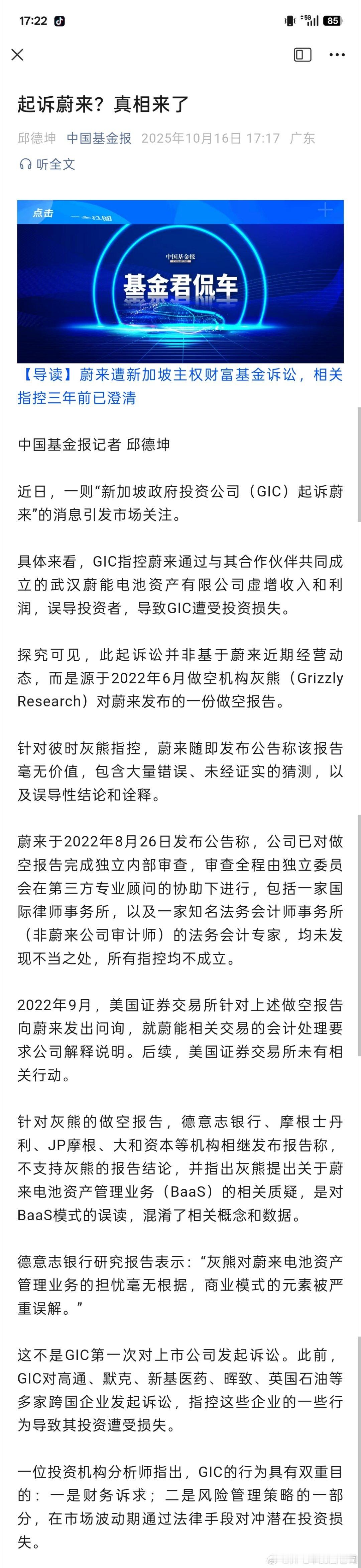 22年的事,蔚来当时已经回应过,第三方已经审查过,指控不成立,情况就是这么个情况