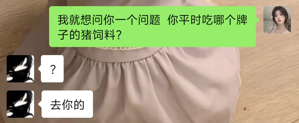 和朋友的搞笑聊天日常!先是装模作样问东问西,最后突然问“你平时吃哪个牌子的猪饲料?”朋友直接回“去你的”,幼稚又好笑~你们有没有试过这样逗朋友呀?