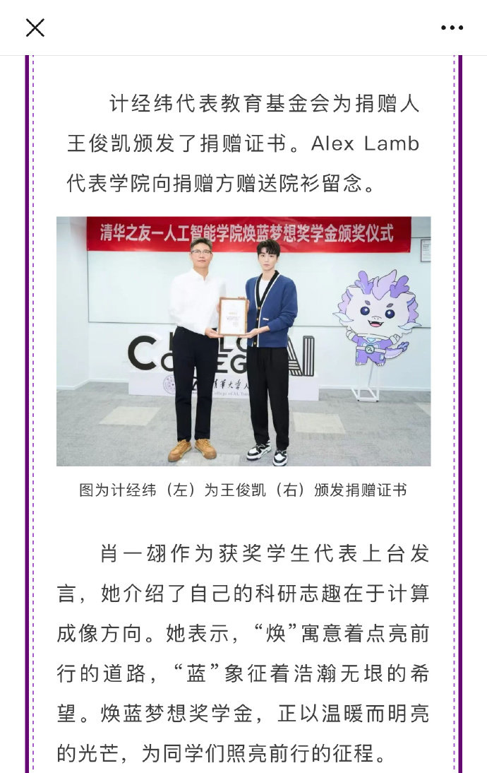 王俊凯真的好棒开始默默做大事了,俊凯联合清华大学人工智能学院设立奖学金。小凯又帅