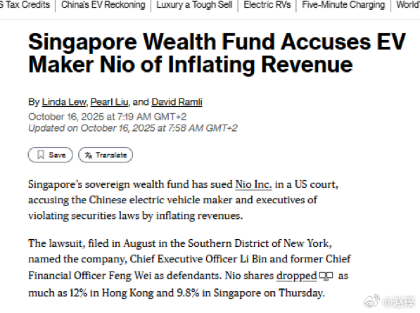 蔚来汽车被新加坡政府投资公司(GIC)指控收入收入虚增,并已在美国法院起诉。