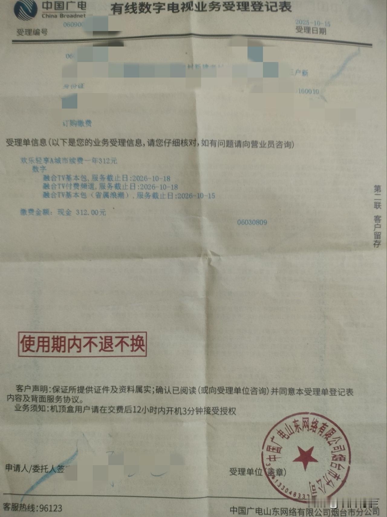 有线电视快到期了,广电营业厅一个月之前就打电话让去交有线电视收视费,我说不是还有一个月才到期吗?广电回答说早点交也是按照到期日才开始算周期的,不会缩短使用时间,我说又没优惠,到期了再交。 离到期日还有两天,去把收视费交了,312元,我感觉这个收费标准已经快20年了吧,说它没有涨价吧,现在怎么感觉很贵呢? 唉,家有90岁的老娘,广电的有线电视用习惯了又有什么办法呢?现在的年轻人谁还看电视?都是拿着手机看,即使偶尔看看电视,也用IPTV或者投屏看,花钱很少或者不花钱,312元,现在真的感觉很贵啊! 朋友们家里有老人,你是不是也给老人按时交有线电视收视费呢?