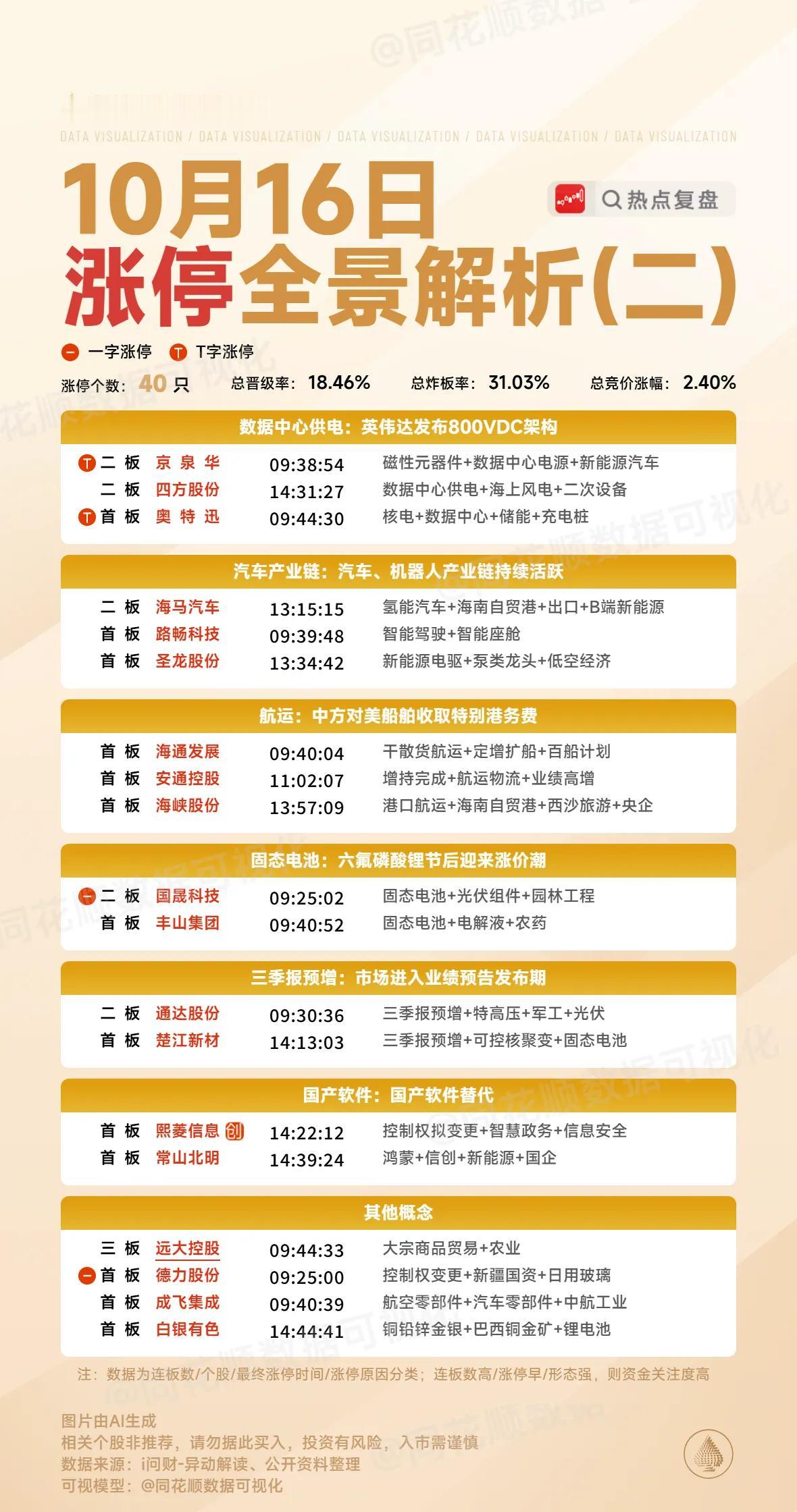 10月16日复盘:常山北明、四方股份、白银有色、楚江新材、合肥城建隔日走势的一些看法! 1、常山北明(华为) 尾盘华为概念异动拉升,常山走出非常强势的直线拉升涨停板,虽然板上出现了一定分歧,但是炸板后依然是快速回封的走势,走出了一个低位的一阳穿三线的倍量首板形态,而且它涨停后,多只华为概念股出现了明显跟随拉升的走势! 盘后的龙虎榜欢乐海岸大买2.66亿,国投朱雀大街、东亚前海分和成都系都是大幅买入,卖盘的整体抛压非常小,榜单整体净流入5.2亿,这样的榜单是非常不错的,尾盘华为的异动拉升是一大看点,近期资金反复在尝试新题材,从之前的军工到光伏,再到昨天的机器人,今天尾盘的华为,市场轮动是非常快的,但是貌似并没有板块走出了比较好的持续性,所以隔日常山能不能强势带动板块是一大看点,从今天的封板强度上看,隔日冲高的溢价有所保证,但是想要连板带动板块,至少竞价就要有超预期表现! 2、四方股份(IDC电源) 早盘竞价整个IDC电源方向还是非常强势的,京泉华开出一字板,四方在首板个股中开的第二好,高开7个点的表现是超预期的,但是开盘后板块出现大幅下杀负反馈,四方也是明显出现资金兑现,但是它下砸后很快有资金承接拉升到分时均线位置横盘,在京泉华顶住分歧回封后,它开始了趋势上行的形态,在放出量能后有资金主动封板,虽然板上有一定分歧,但是最终还是彻底封死涨停! 四方这个二板虽然开板多次,但是可以看到其实它板上承接是非常好的,根本看不出来是一个烂板走势,再加上它量能释放充分,板块还有一个京泉华跟它携手晋级,隔日一旦板块出现比较强的修复,它还是很有看点的,至少不会像核建一样连溢价都没有,隔日可以重点结合京华泉一起看,毕竟是同一个板块,京泉华今天是T字板高换手晋级,它的盘子相对来说较小,隔日如果开盘能够继续强势冲板的话,四方作为中军是很可能走出跟随的,但是,如果板块明显颓势,四方相对来说也更抗跌一些! 3、白银有色(贵金属) 黄金白银期货是大涨的,白银作为之前这个方向最强的个股早盘竞价红开就是明显强势表现,所以开盘是有资金去强势做多的,但是整个板块并没有明显跟随,所以白银板上抛压非常大,之后全天都是在高位的分歧表现,直到尾盘才有资金承接去封死涨停,走出了一个高位的烂板走势! 白银这个涨停跟昨天的核建非常类似,之所以没有资金去强势封死它主要原因是板块并不强势,另外就是大盘明显缩量,白银这种盘子的个股没有板块支撑的情况下获利盘会选择兑现,所以隔日白银能不能有溢价很难说,晚上的黄金白银期货的表现是看点,一旦期货开始回调,隔日白银可能很难给到溢价表现,这只个股这种形态想要连板几乎是不可能了! 4、楚江新材(业绩) 楚江因为业绩走出了一个一字板,昨天是明显的大幅高开调整,早盘竞价突然出现资金跳空抢筹这只个股,所以开盘后迅速出现资金拉升做多封板,在板上出现了一定分歧放量后彻底封死涨停,但是随着大盘的跳水,它也出现了明显资金兑现,盘中一度跌破分时均线,好在是有资金承接回来,直到尾盘才有资金再次做多封板,走出了一个明显烂板的反包板! 盘后的龙虎榜买盘有江苏路这种知名游资进场接力,卖盘主要是机构砸盘兑现,榜单是明显的资金换手,这样的榜单其实不差,但是楚江今天的形态确实够烂,隔日能不能给到溢价真的很难说,虽然楚江概念一大堆,但是这只个股历来股性不活跃,不管哪个板块强势,它都很难出现涨停,所以这个反包板走成烂板的情况下,隔日能给到冲高就已经非常不错了! 5、合肥城建(长鑫科技+地产) 早盘竞价合肥抢到红盘开,再加上早盘地产和存储芯片都有明显板块效应,合肥作为昨天被错杀的个股,开盘就有资金强势拉升做多封板,在板上出现了一次小分歧后迅速回封,但是之后盘中再次出现了一次明显的资金兑现炸板,好在分时均线处有强支撑,在放出一定量能后有资金进行了承接回封,走出了一个比较强势的反包形态! 合肥这个涨停板还是非常强势的,关键它还切合了今天市场的两大热点,隔日的预期就很高,一旦竞价出现非常强势的表现,它是有继续连板预期的,毕竟现在市场短线生态非常不好,在高标接连兑现的情况下,合肥如果能够走出连板反包,或许会成为市场下一个热度,对于几个未IPO的巨头,宇树带动过首开,摩尔线程带动过和而泰,新凯来带动过至纯,更牛逼的是上海微电子带动的华建,那么长鑫科技会不会持续带动合肥,就非常有看点了,毕竟从流通市值上看,合肥的空间确实还比较大,比较有想象空间! 文中的内容仅为分享和交流,不作为实际操作建议!