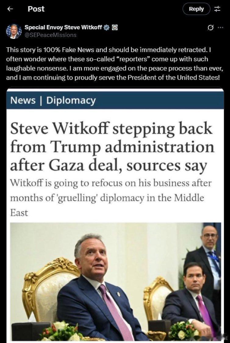 3、特朗普中东问题特使维特科夫称 MEE 关于他决定辞职的报道是“100% 的假新闻”。“我比以往任何时候都更加致力于和平进程,并将继续自豪地为美国总统服务!”