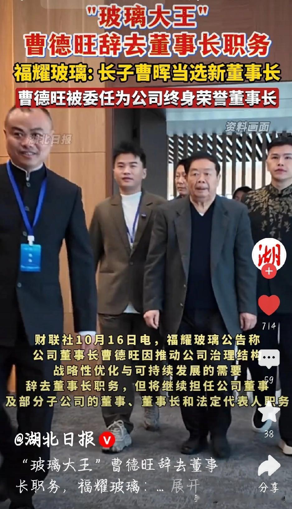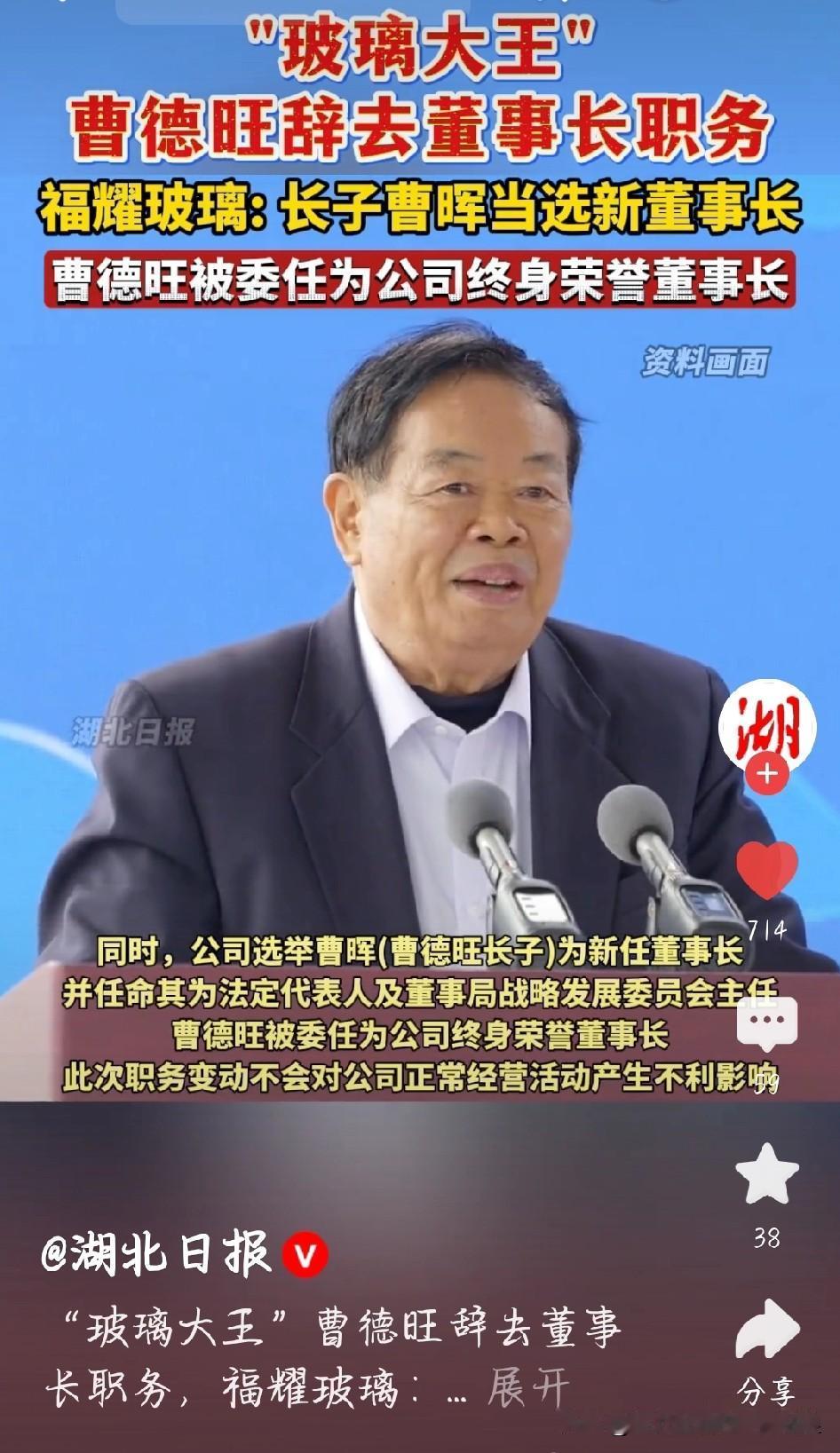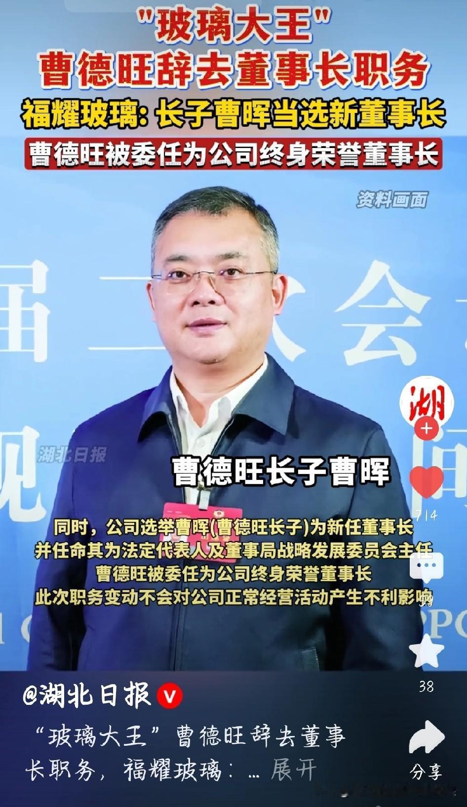 曹德旺卸任福耀董事长!80岁大佬功成身退,接班的是亲儿子 福耀玻璃炸出大消息:曹德旺辞去董事长了!这位掌舵福耀二十多年的大佬,把小厂子干成全球汽车玻璃龙头,现在终于说要退休了。 有人担心他身体出问题?别瞎猜,曹德旺自己说了,身体好着呢,就是八十岁了,该让年轻人接手了。而且他没彻底不管,留任董事还成了“终身荣誉董事长”,关键战略还能帮着把把关。 接棒的也不是外人,是他55岁的儿子曹晖。这可不是空降的“少爷”,曹晖在福耀基层干过,懂业务又熟团队,公告里都明说了,这事不影响公司正常经营。 曹德旺这波退得明白:把家业交给靠谱的后人,自己能歇下来,企业也能换新鲜血液。从白手起家到行业巨头,再到平稳交棒,这才是真·大佬的落幕方式!为这位实干企业家点个赞!福耀玻璃公司 福耀玻璃待遇 曹德旺回应辞职:对福耀更有好处 曹德旺 图片截图于湖北日报