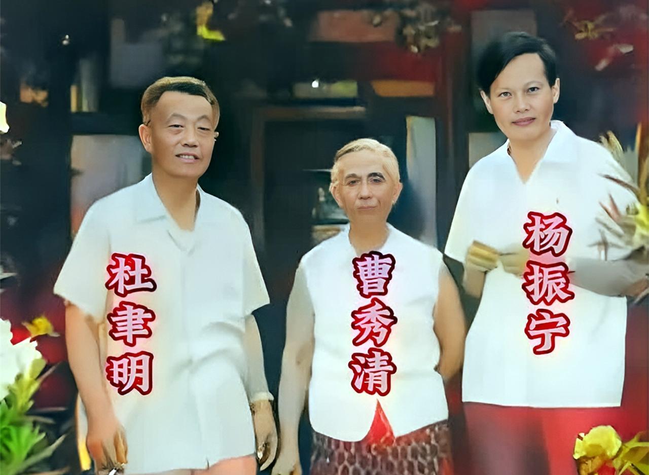 这是杨振宁与岳父杜聿明、岳母曹秀清。不论是杜聿明,还是曹秀清都非常感激杨振宁。1959年,杜聿明能从功德林监狱被特赦。一方面是因为自己接受积极改造且改造良好,另一方面是因为女婿杨振宁获得诺贝尔物理学奖。这瞬间让杨振宁成为国际知名人物。相关人员也希望通过杜聿明能与杨振宁取得联系。杜聿明自然会被另眼相看,并会受到特殊照顾。 岳母曹秀清更是对女婿杨振宁感激不已。因为,曹秀清与杨振宁的关系,所以台方面希望曹秀清能到美国说服杨振宁到台,并为其买了往返的机票。不料,曹秀清将返回的飞机票换钱后留给在台的儿子,自己到了美国从此未再回台。后来,在女婿杨振宁的帮助下,曹秀清辗转回到大陆,与分离多年的丈夫杜聿明团聚。