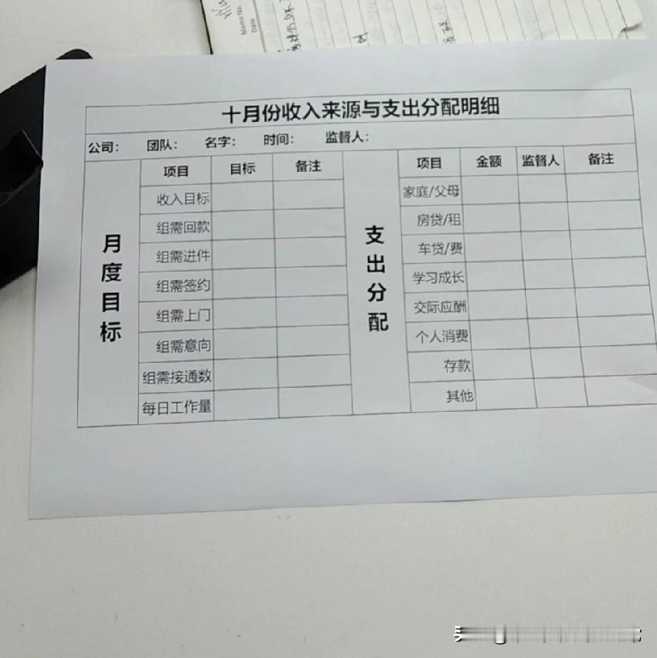 公司发的,可以填? 公司发了张“十月收入支出分配明细”表,要求咱把收入目标、房贷车贷甚至个人消费都列得明明白白!这是想帮咱理财,还是变相查家底? 填的时候我麻了:收入目标敢写高吗?写高了完不成多尴尬;支出明细写细了,那点工资根本兜不住!咱打工人每天算着KPI,现在还要算着柴米油盐的账,这哪是明细单,简直是“打工人财务刑具”! 可反过来想,真把收支理清楚,是不是能少当“月光族”?但公司插手个人财务,到底是关心还是越界?你们说,这张表是该认真填,还是当成废纸扔一边?