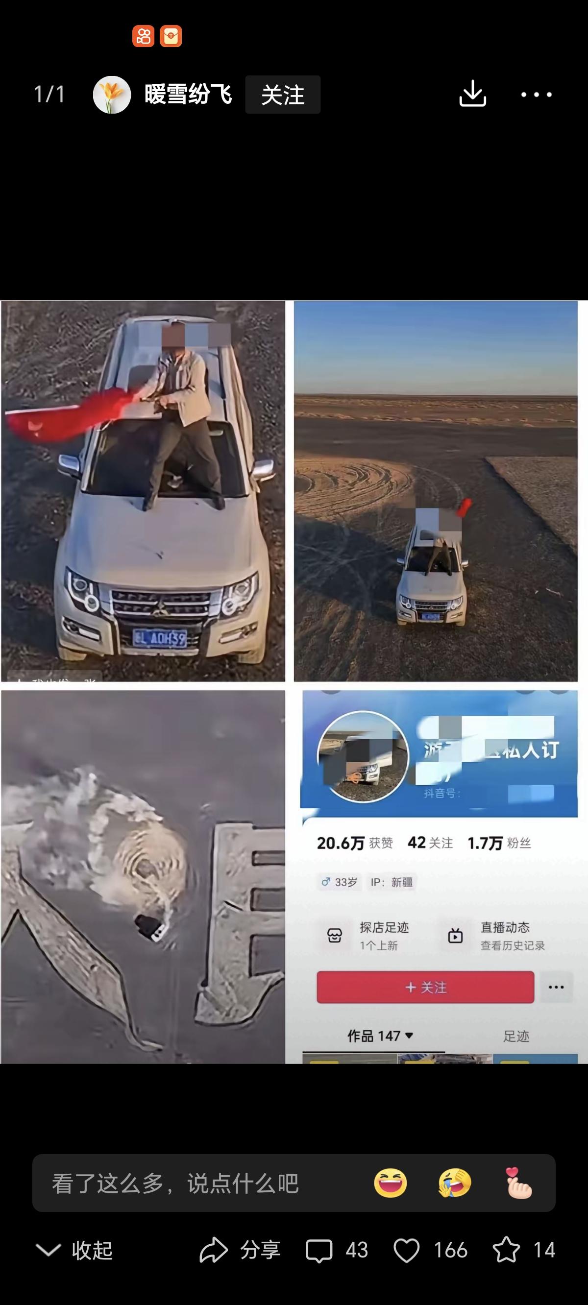 天狂必有雨,人狂必有祸! 在新疆戈壁滩地标上飘逸打圈 站在车顶挥舞国旗,还不忘拍视频炫耀,那阵仗堪比登上月球 被网友找到后,知道怕了,赶紧删掉视频,什么也承认,还反咬一口说自己被网暴了。 手举着国旗,脚下践踏着土地。这回谁都救不了你,人要为自己行为负责! 这种在敏感地貌肆意越野的行为直接违反了《中华人民共和国自然保护区条例》。新疆戈壁生态系统极其脆弱,车辆碾压造成的土壤结构破坏需要数十年才能自然恢复。2022年就有科考数据显示,罗布泊地区车辆碾压过的地表,植被恢复周期超过30年。这不是普通的自驾游,而是对脆弱生态的野蛮破坏。 事件发酵过程中,网友的监督起到了关键作用。据中国互联网协会数据,2023年通过网络曝光并最终处理的生态破坏事件同比上升42%。这种公众监督正在形成一种新型的社会治理力量,让每个破坏环境的行为都可能面临全民监督,有效弥补了偏远地区执法力量不足的问题。 该当事人事后辩称“被网暴”,却回避了核心问题——在生态保护区违法驾驶。2021年修订的《环境保护法》明确规定,造成生态环境损害的个人需承担修复责任。举着国旗不能成为违法行为的护身符,真正的爱国体现在具体行动中对每一寸土地的敬畏与爱护。 类似事件频频发生,反映出部分人法律意识和生态观念的缺失。发展旅游探险不能以牺牲环境为代价,网络时代每个人的行为都处在公众视野中。既要享受自然之美,更要担负保护之责,这才是现代公民应有的素养。