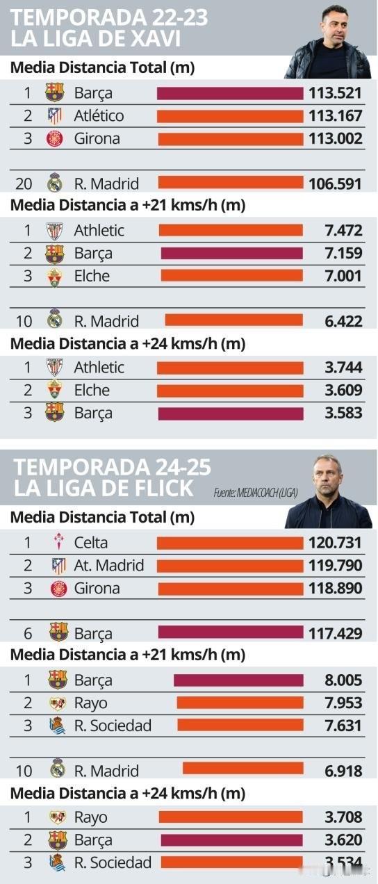 西甲前八轮比赛中,有14支球队的跑动距离超过巴萨。 俱乐部在汉斯·弗里克上任时