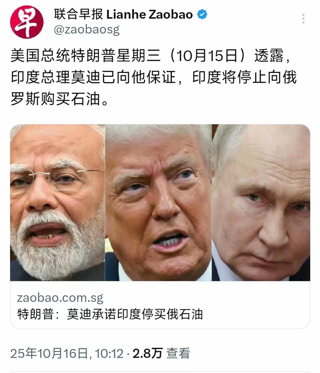 特朗普是痴呆了吗?彭博社报道:15日(周三)印度外交部表示,不知道特朗普提到的他与莫迪周三的会谈情况,而特朗普就在当天的几个小时前说,他与印度总理莫迪进行了交谈,莫迪承诺将停止购买俄罗斯石油,特朗普还说“我们要让中国也做出同样的保证”。 特朗普一定是把美好的梦境当成了现实,好在他没有说中国也向他作出了停止购买俄罗斯石油的保证。特朗普是公然造假还是已经痴呆啦?难怪有美国医疗专家称特朗普已经痴呆。 如果特朗普是故意造假还好,因为一直这样;若是痴呆了问题就非常严重,因为他是有权动用核武器的人。