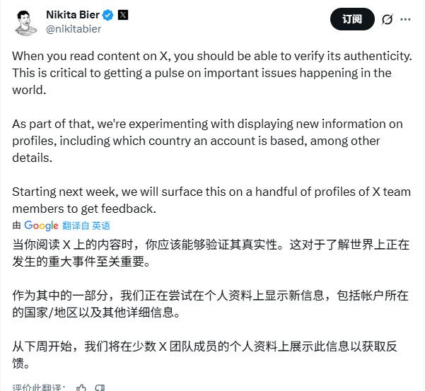 X的产品负责人Nikita Bier10月15日在X上宣布,X将在用户的公开资料上显示IP的所在国位置,从下周开始将开始小范围测试。国内的社媒早就显示了IP地址,完全没想到X还没有这个功能。我自己觉得显示IP挺好的,至少知道自己是和一个真实的人在交流,而不是一个虚假的账号。