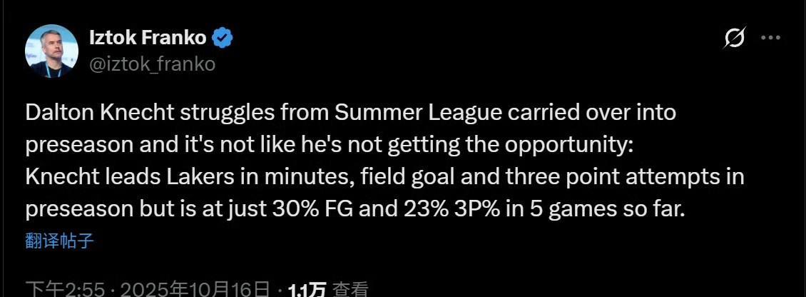 克内克特持续低迷,还有希望拯救吗? 据NBA记者Iztok Franko报道:克内克特从夏季联赛的挣扎一直延续到了现在,这并不是说他没有获得机会,他的出场时间还有出手数是球队最多的,但到目前为止,5场比赛后,场均仅9.4分,投篮命中率只有30%,三分球命中率低至23%。 在防守端移动缓慢,频繁失去防守位置,进攻端依赖外线手感,但是缺乏自主进攻能力,算是彻头彻尾的三无产品(无稳定得分、无持球能力、无防守能力)或者说是球队的负资产。 球迷一度调侃称其是烂泥扶不上墙,更是拿上一任17顺位水货熹妃诺相比较。 克内克特的低迷已经持续了几个月的时间,若无法在赛季初期扭转颓势,他的职业生涯怕是也就这样了,面临他的只有两个选择,要么裁掉,要么被交易,但是这种表现很难有球队愿意接手。#湖人# #洛杉矶湖人# #NBA吐槽大会# #NBA热点#