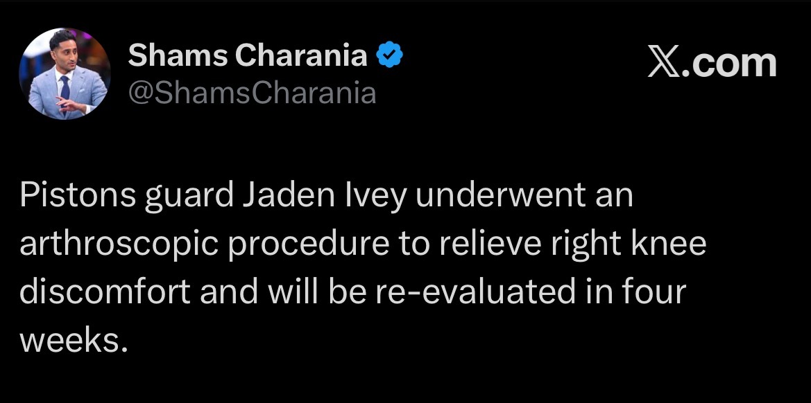 Shams:活塞队后卫贾登·艾维已接受关节镜手术,以缓解右膝不适,他将在四周后接