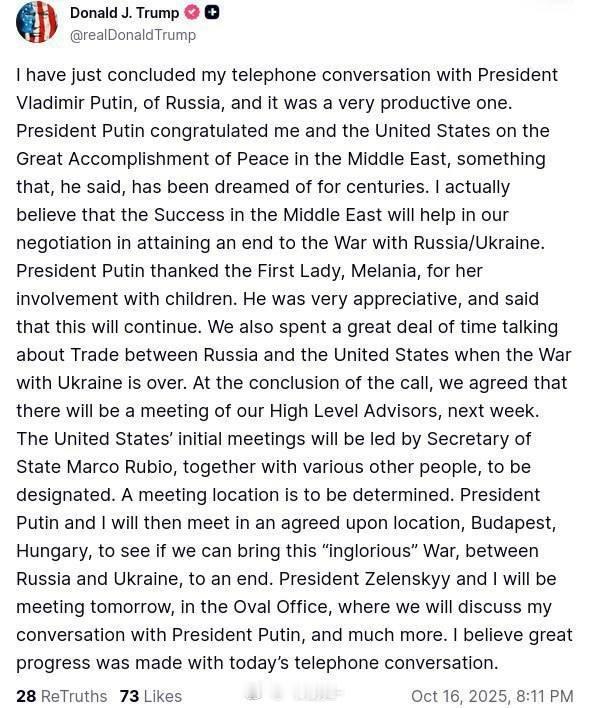 ➖“我们已同意下周安排我们高级顾问的会面。首次会面将由国务卿马尔科·鲁比奥主持,还有其他几位人员,具体名单待定。会面地点稍后确定。随后,我将与普京总统在协商好的地点——匈牙利布达佩斯会面,讨论我们是否能够结束这场俄罗斯与乌克兰之间的‘无光彩’战争,”特朗普写道。