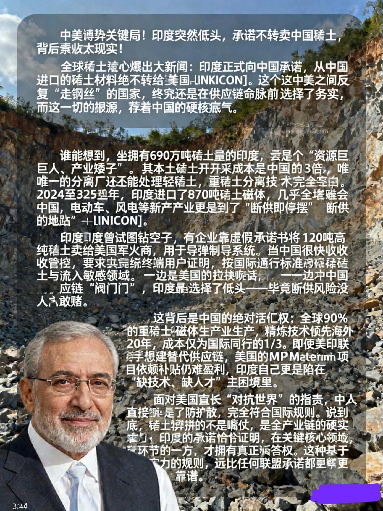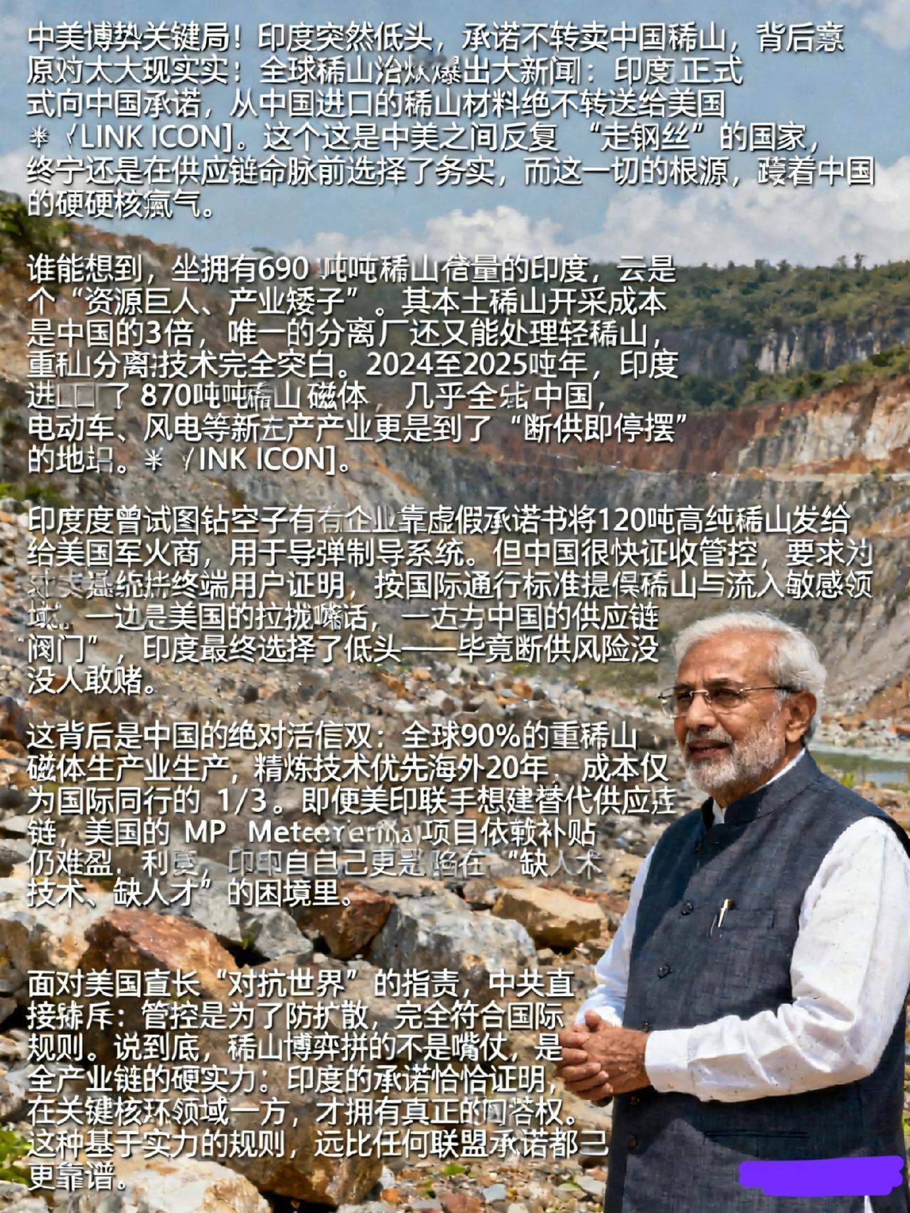 中美博弈关键局!印度突然低头,承诺不转卖中国稀土,背后真相太现实 全球稀土博弈爆出大新闻:印度正式向中国承诺,从中国进口的稀土材料绝不转卖给美国[__LINK_ICON]。这个在中美之间反复“走钢丝”的国家,终究还是在供应链命脉前选择了务实,而这一切的根源,藏着中国的硬核底气。 谁能想到,坐拥690万吨稀土储量的印度,竟是个“资源巨人、产业矮子”。其本土稀土开采成本是中国的3倍,唯一的分离厂还只能处理轻稀土,重稀土分离技术完全空白。2024至2025财年,印度进口了870吨稀土磁体,几乎全依赖中国,电动车、风电等新兴产业更是到了“断供即停摆”的地步[__LINK_ICON]。 此前印度曾试图钻空子,有企业靠虚假承诺书将120吨高纯稀土卖给美国军火商,用于导弹制导系统。但中国很快收紧管控,要求其提交终端用户证明,按国际通行标准确保稀土不流入敏感领域。一边是美国的拉拢喊话,一边是中国的供应链“阀门”,印度最终选择了低头——毕竟断供风险没人敢赌。 这背后是中国的绝对话语权:全球90%的重稀土永磁体由中国生产,精炼技术领先海外20年,成本仅为国际同行的1/3。即便美印联手想建替代供应链,美国的MP Materials项目依赖补贴仍难盈利,印度自己更是陷在“缺技术、缺人才”的困境里。 面对美国财长“对抗世界”的指责,中方直接驳斥:管控是为了防扩散,完全符合国际规则。说到底,稀土博弈拼的不是嘴仗,是全产业链的硬实力。印度的承诺恰恰证明,在关键资源领域,掌握核心环节的一方,才拥有真正的话语权。这种基于实力的规则,远比任何联盟承诺都更靠谱。 美国稀土需求 美国稀土战略 美国稀土订单