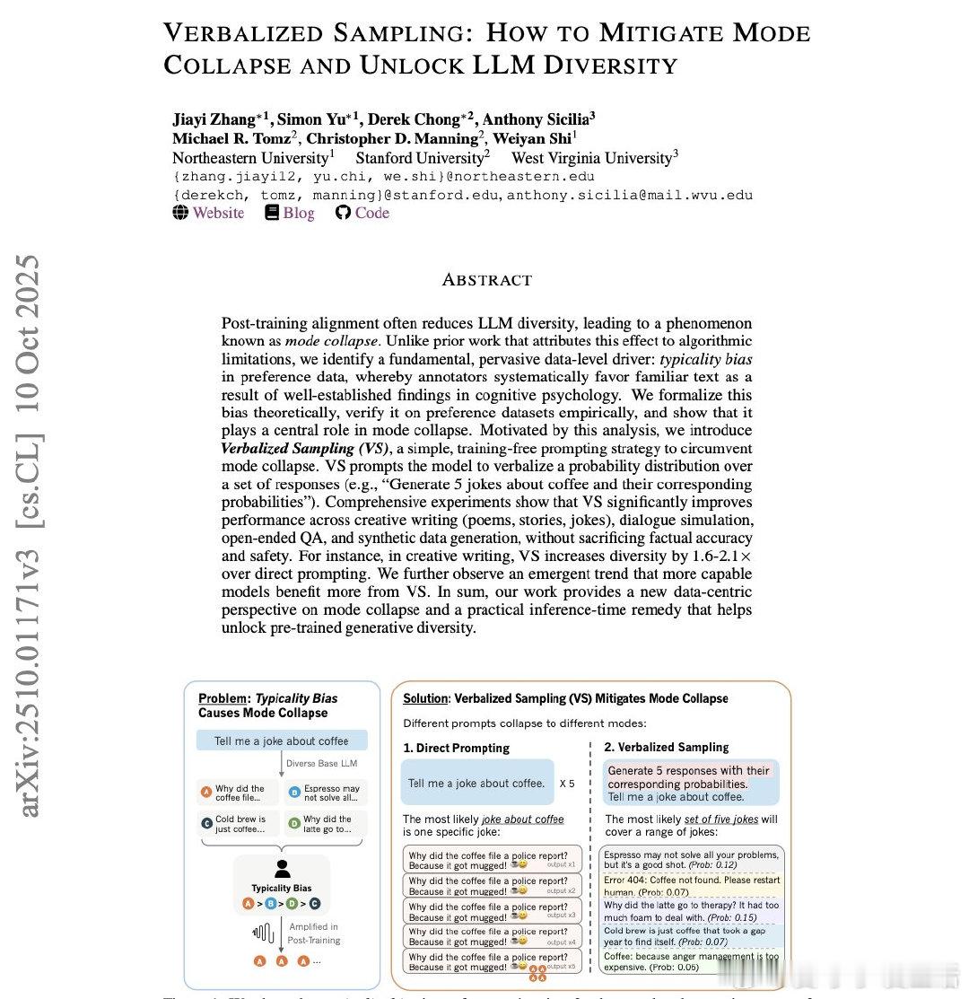 斯坦福最新论文提出“言语采样”(Verbalized Sampling)技术,颠覆了我们对大模型模式崩溃(mode collapse)问题的认知。