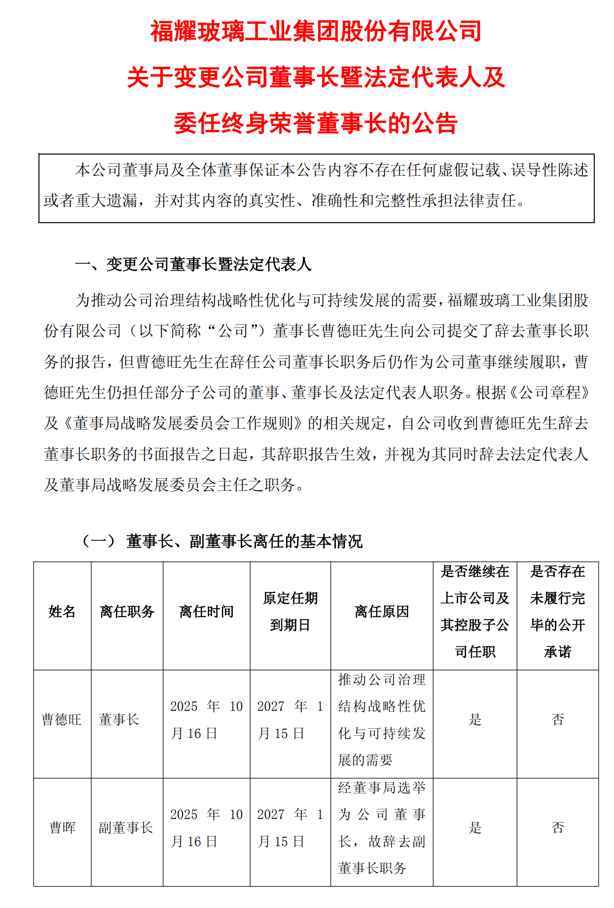 福耀玻璃公告,曹德旺卸任董事长,由曹德旺之子曹晖接任。​​​
