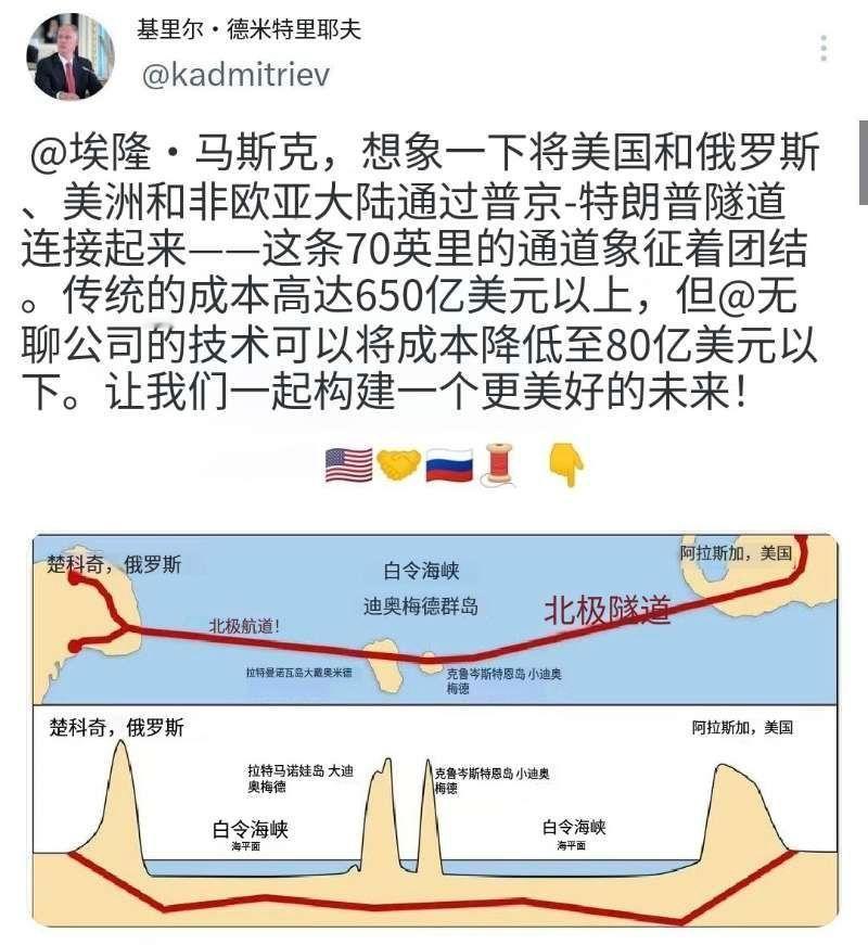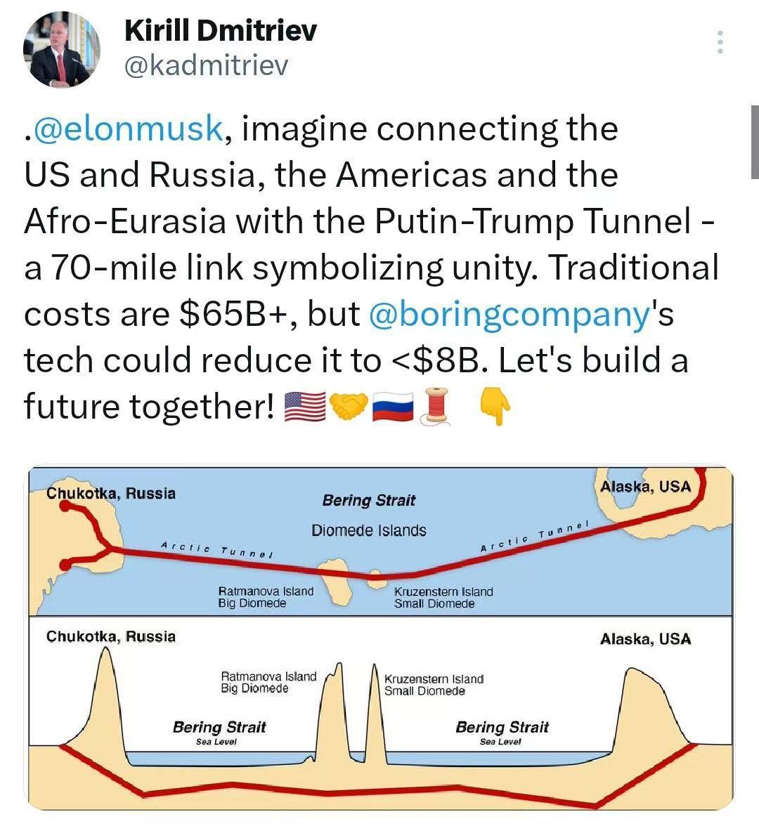 【总有一天,高铁🚄会开到合恩角】普京的经济顾问、俄国🇷🇺国家主权基金CEO: 开挖建设白令海峡俄罗斯—— 美国🇺🇸阿拉斯加海底隧道连接两大洲,又称普京——川普隧道是可行的。