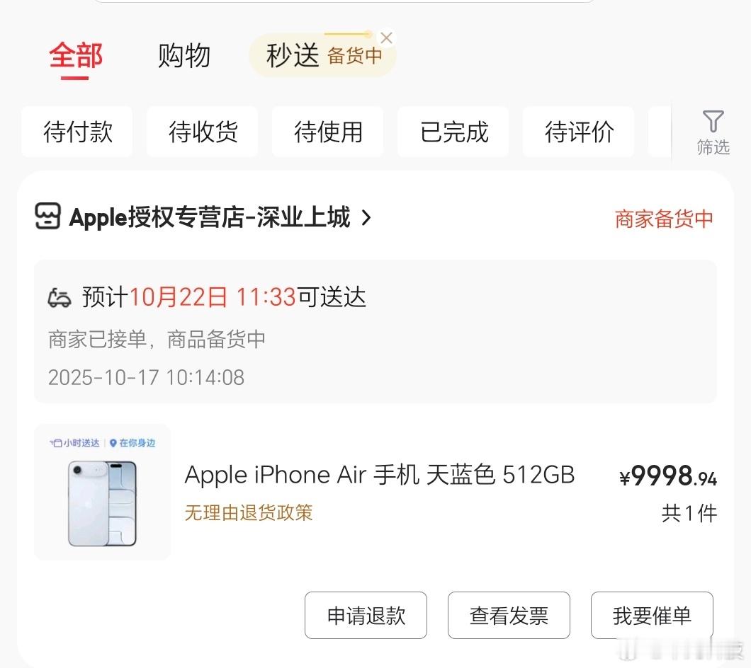 iPhoneAir正式开售感觉iPhone Air没人买啊,怎么随便一点就抢到了?讲真,这手机能做主力机使用吗?要不退掉算了![笑cry]