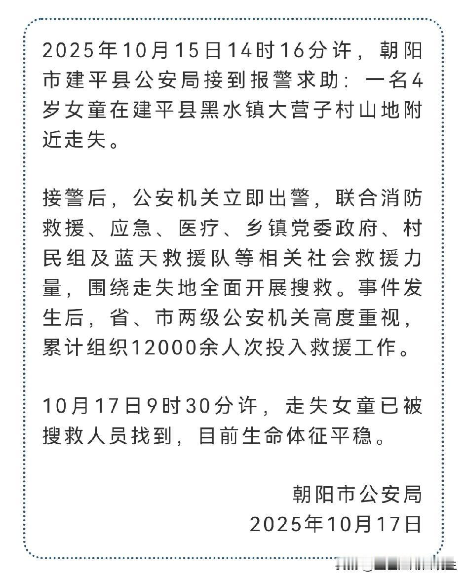 建平4岁走失女童已经找到了!请各位东北人放心,在咱大东北啥都丢不了尤其是孩子,今天也就是10月17日上午9点半左右,上万人的搜救人员终于在一处山沟里发现了丁一,她穿着走失时的红色上衣,被无人机捕捉到身影,有报道说在降温下雨时孩子钻进了山洞避寒,这是她平安度过四十多小时的关键,万幸的是孩子找到后被快速送到医院检查,目前状态平稳孩子平安无事。 请各位把心放肚子里吧,再次叮嘱各位家长请务必看好孩子,不要让孩子离开视线。