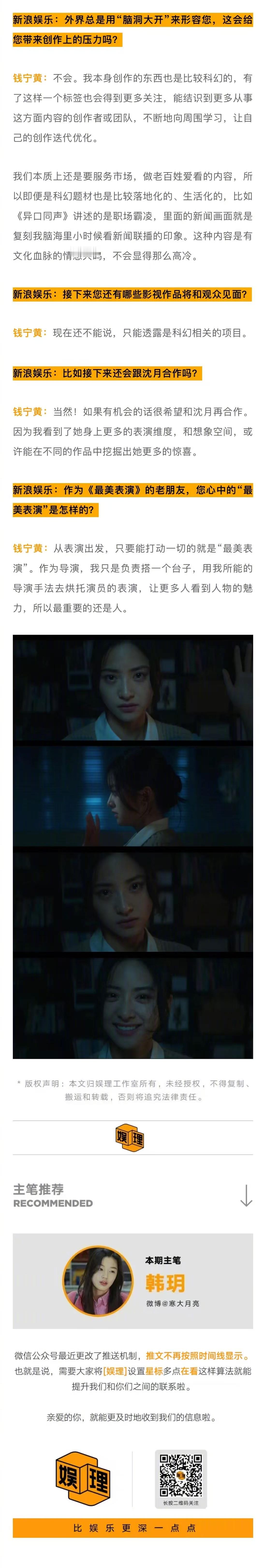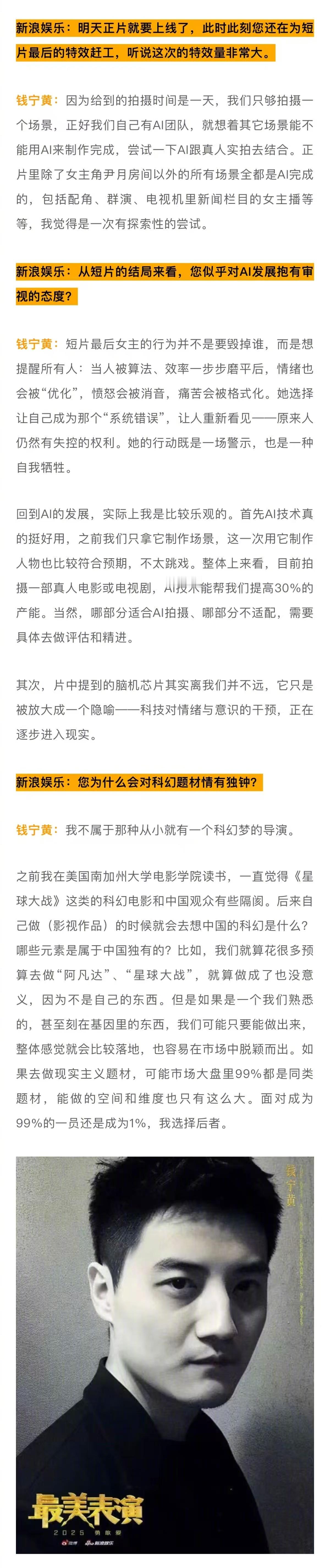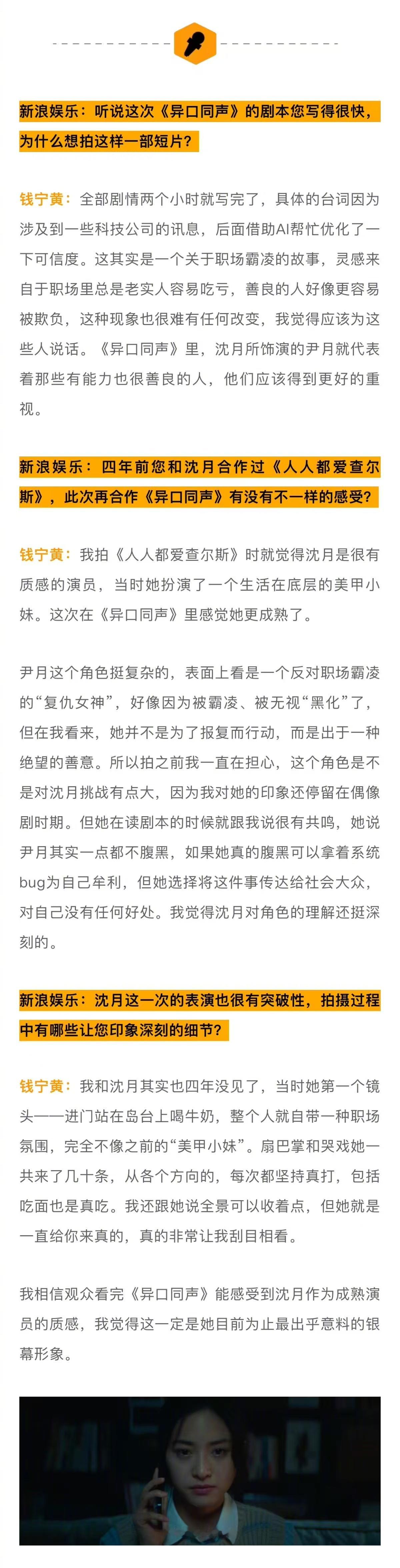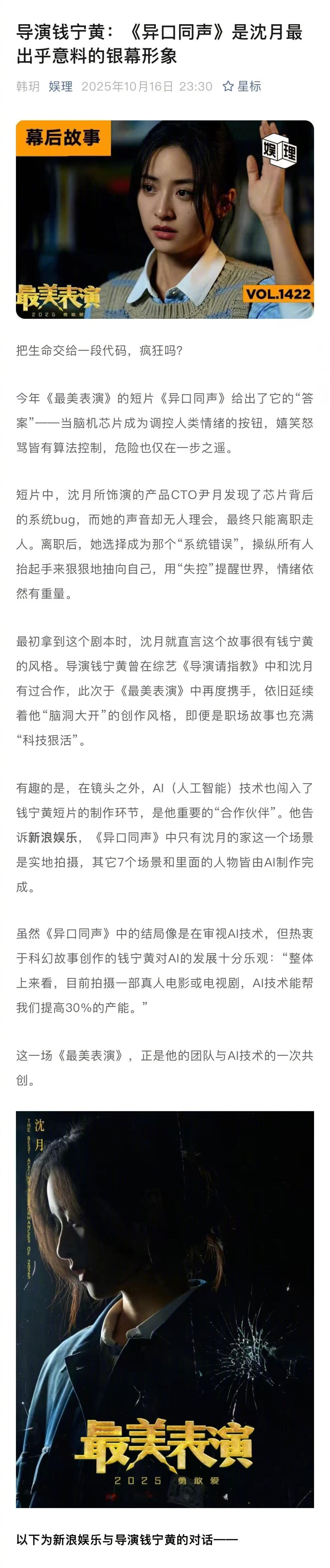 沈月短片只有一个实景其他全是AI导演称沈月扇巴掌十几次都来真的 《最美表演》之《异口同声》导演钱宁黄在专访中透露,沈月戏份仅用一天实景拍摄,剩余场景与人物均靠 AI 打造。谈及二次合作,导演直言沈月愈发成熟,还爆料她拍扇巴掌和哭戏时,前前后后拍了几十条,次次坚持真打。完整版专访⬇️