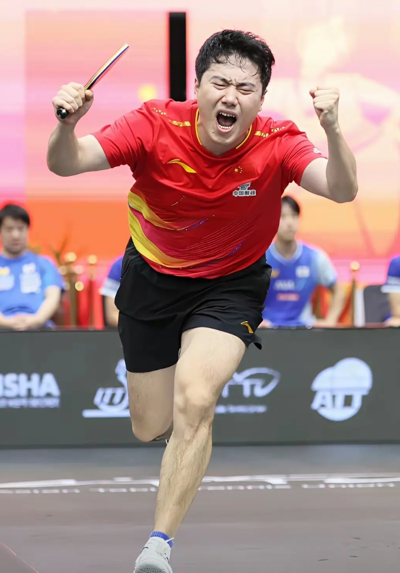 这张照片太震撼,竟然连他腿上的汗毛都拍的那么的清晰。最能体现梁靖崑全力以赴拼赢了的心情和状态。这可能是他乒乓生涯中最燃,最激动,也是最动人的时刻!