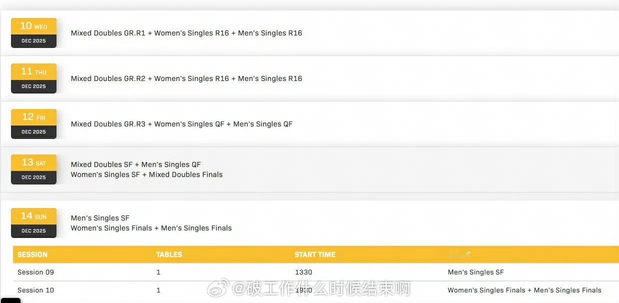 🏓12月11 日(周四):混双小组赛第2轮、女子单打 16 强赛、男子单打 16 强赛;