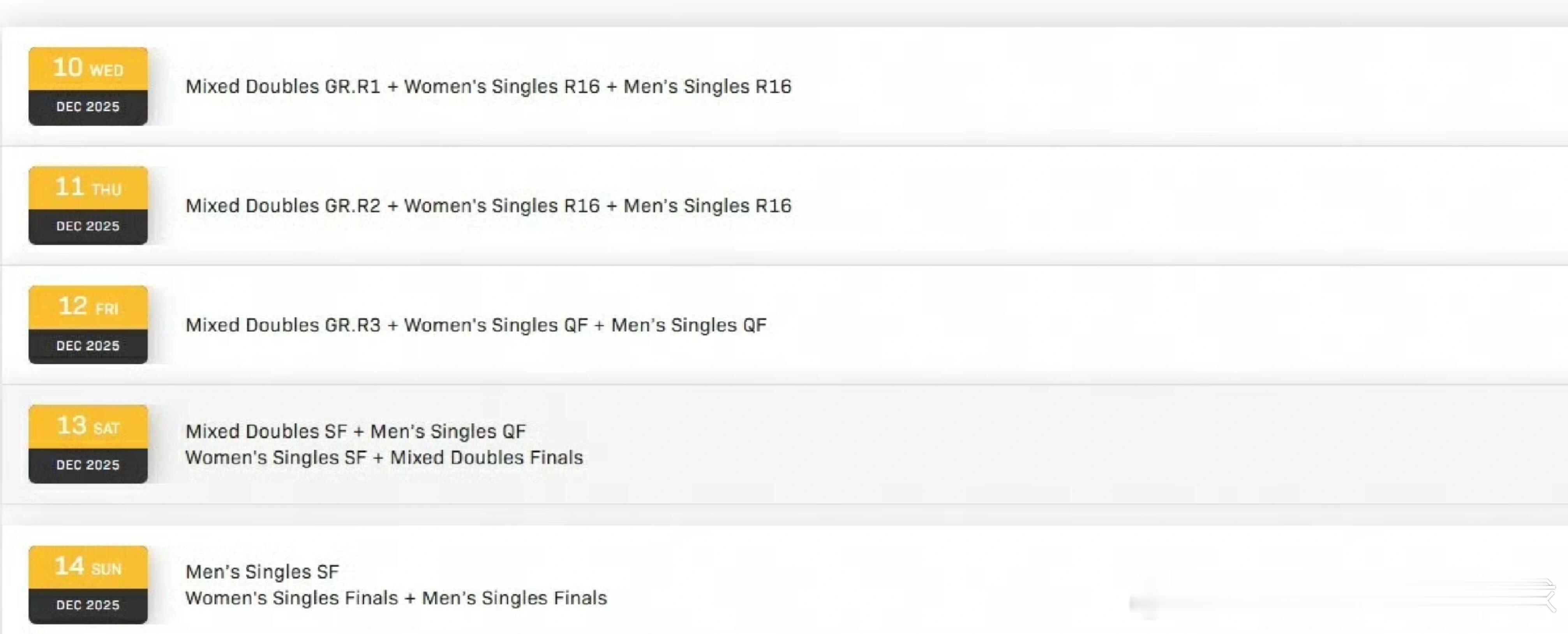 12月11 日:混双小组赛第2轮、女子单打 16 强赛、男子单打 16 强赛;