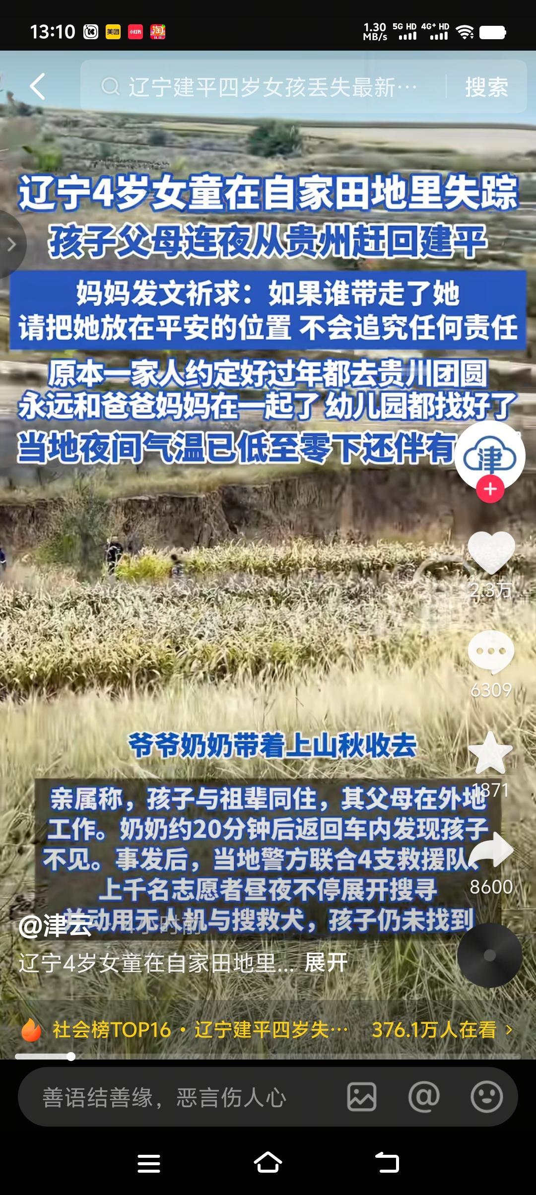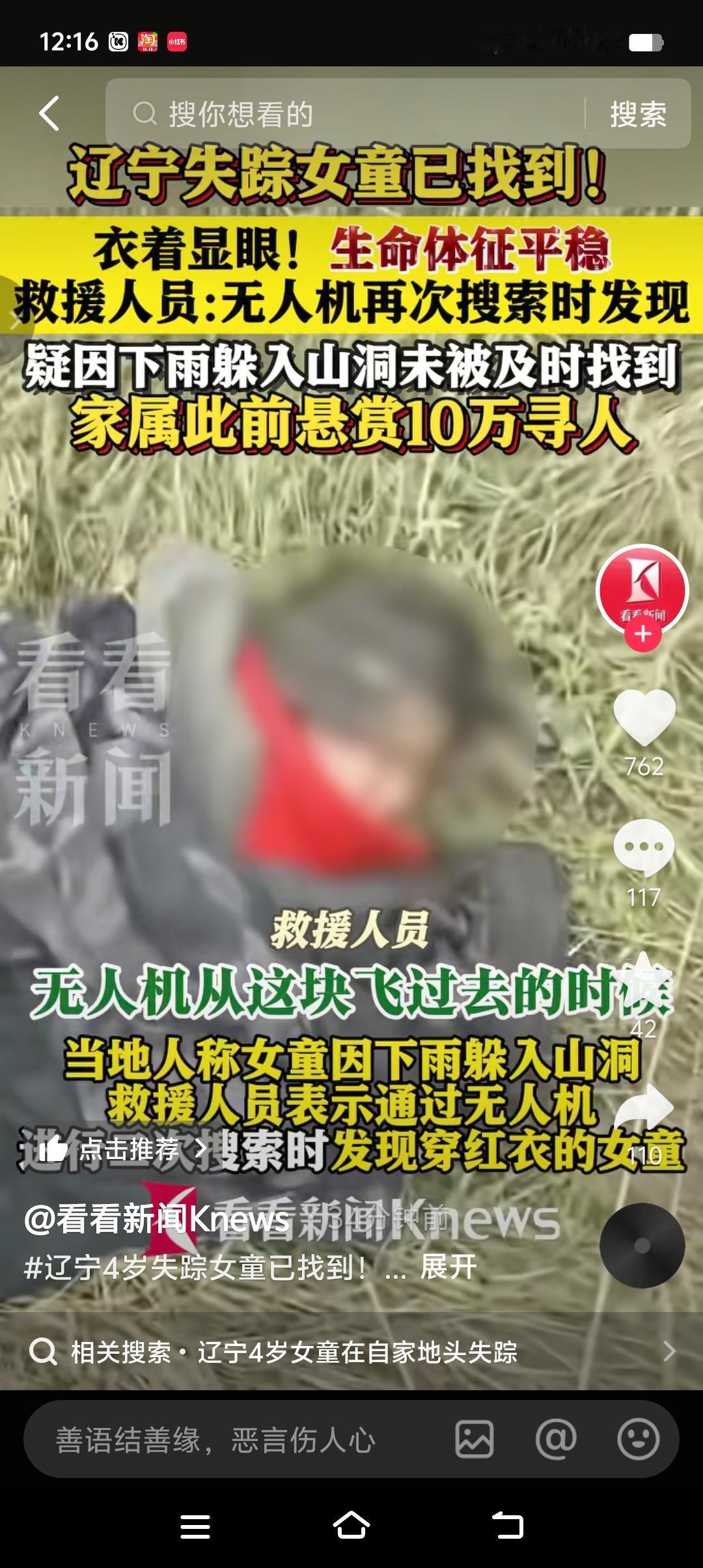 万幸,万幸!辽宁丢失的4岁女童找到了。 生命体征平稳,能叫爷爷奶奶,还能与救援人员对话。说明身体无大碍,只是受到饥饿、寒冷、惊恐等身体出现一些波动。 无人机锁定山洞,发现有红色物体,最终成功获救。可能是由于慌不择路掉到沟里,正好赶上昨晚下雨,晚上东北天气又比较冷,于是小女孩找了个山洞钻进去,不得不说小小年纪还是非常聪明的。 虽然有惊无险,但想一想确实让人感到后怕,丢失近40个小时,就算没有老鹰和野兽出没,仅仅是饥寒交迫,一个四岁的小女孩还能坚持多长时间? 前有兄妹俩被外婆带到地里干活被胡蜂蜇死,如今又发生爷爷奶奶把孙女带到地里干活丢失。看似偶然,其实正是反映了留守儿童的一种无奈和辛酸。