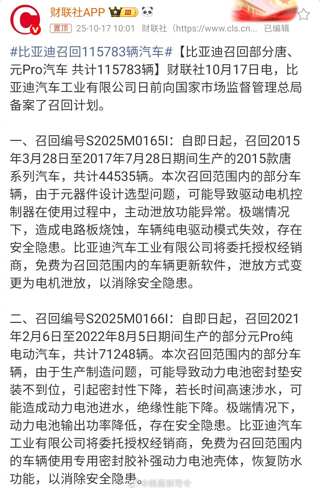 #比亚迪召回115783辆汽车#一个是可能导致驱动电机控制器在使用过程中,主动泄放功能异常。一个是可能导致动力电池密封垫安装不到位,引起密封性下降,若长时间高速涉水,可能造成动力电池进水,绝缘性能下降。
