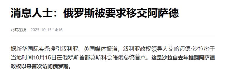 叙利亚临时总统朱拉尼在2025年10月15日与俄罗斯总统普京会谈时,正式提出引渡