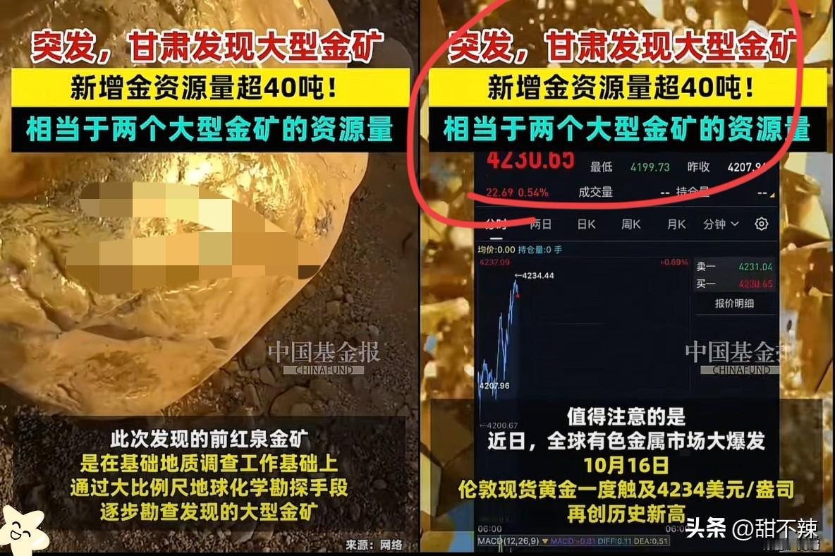 忽然宣布发现大型金矿, 背后的考量值得深思! 金价刚冲过4380美元又急跌100美元,这节骨眼甘肃玉门爆出超40吨大型金矿,这波操作绝不是巧合! 身边朋友都快“炒金上头”了,有人甚至想贷款进场,这不就是当年“股疯”的翻版吗?银行都在紧急提示风险,说别重仓单一资产,可没人听! 其实这金矿更像给市场泼的冷静剂。40吨看着多,但开采周期长,短期影响不了供需! 真正目的是敲醒大家:黄金不是稳赚不赔的买卖,现在市场拥挤度已经很高,随时可能回调! 国家这是在亮底牌,告诉我们有资源兜底,别被短期涨跌牵着走。那些想着靠黄金一夜暴富的,可得想清楚了! 对此大家怎么看?