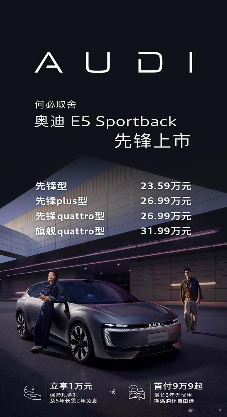跟朋友聊车,他说BBA终于有台让他心动的新能源车了,一问是奥迪E5 Sportback!叠加上市权益后才22万起,还包括:59寸四联屏、无图NOA、800V快充10分钟补能370km,quattro四驱+双电机,零百加速仅3.4S……让人感叹啊,这性价比在豪华品牌里绝对是头一遭!以前买BBA新能源总被人说人傻钱多体验差,E5可以说直接颠覆豪华品牌印象了。