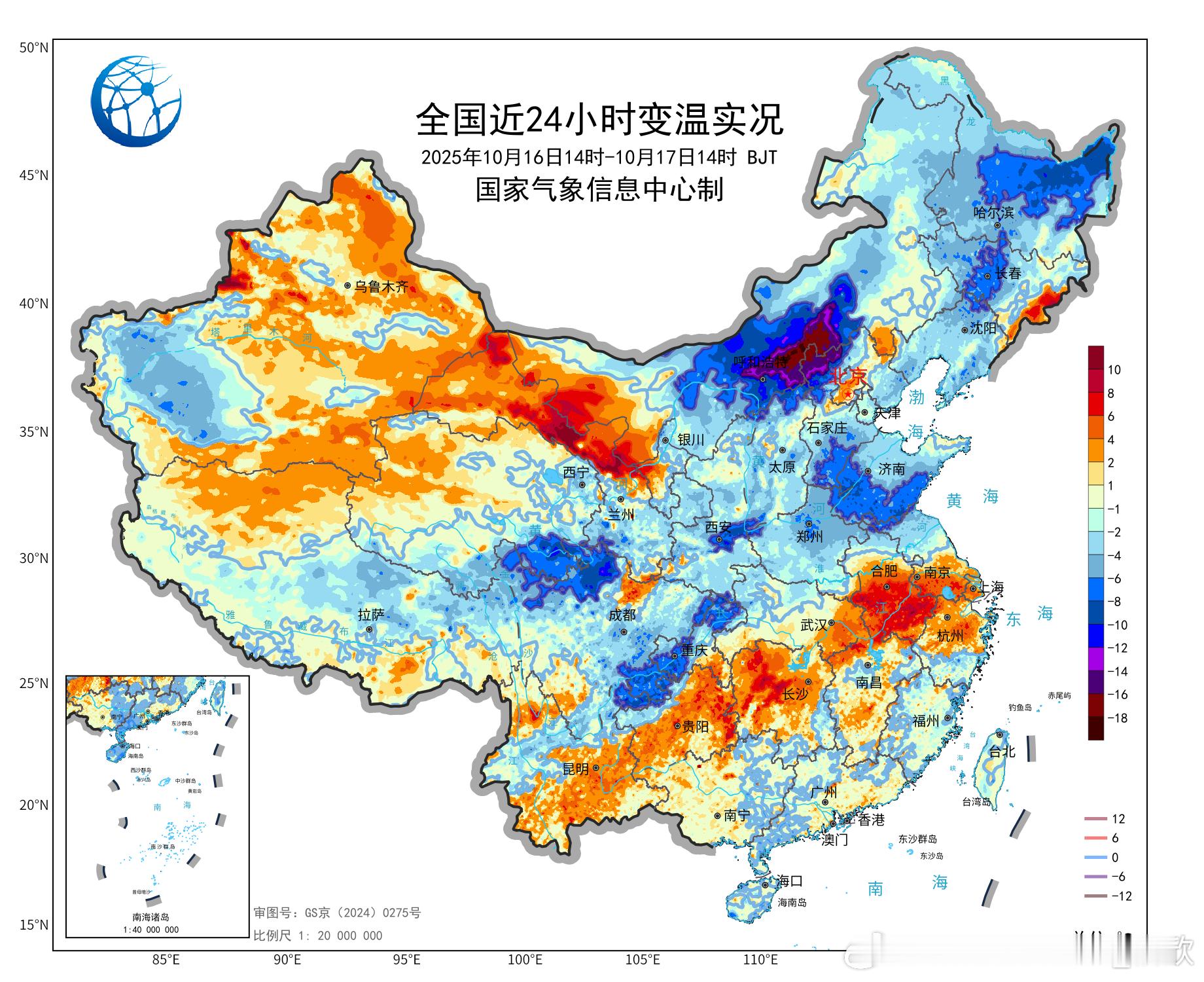 【南北冷热不均】今天截至14时最高,江西上犹出现35℃高温,创当地最晚高温日纪录,对应在副热带高压控制下,天气晴热。北方多地因为冷空气以及阴云遮挡光照的影响,出现降温。内蒙古和河北交界一带,降温最剧烈,局地超17℃。