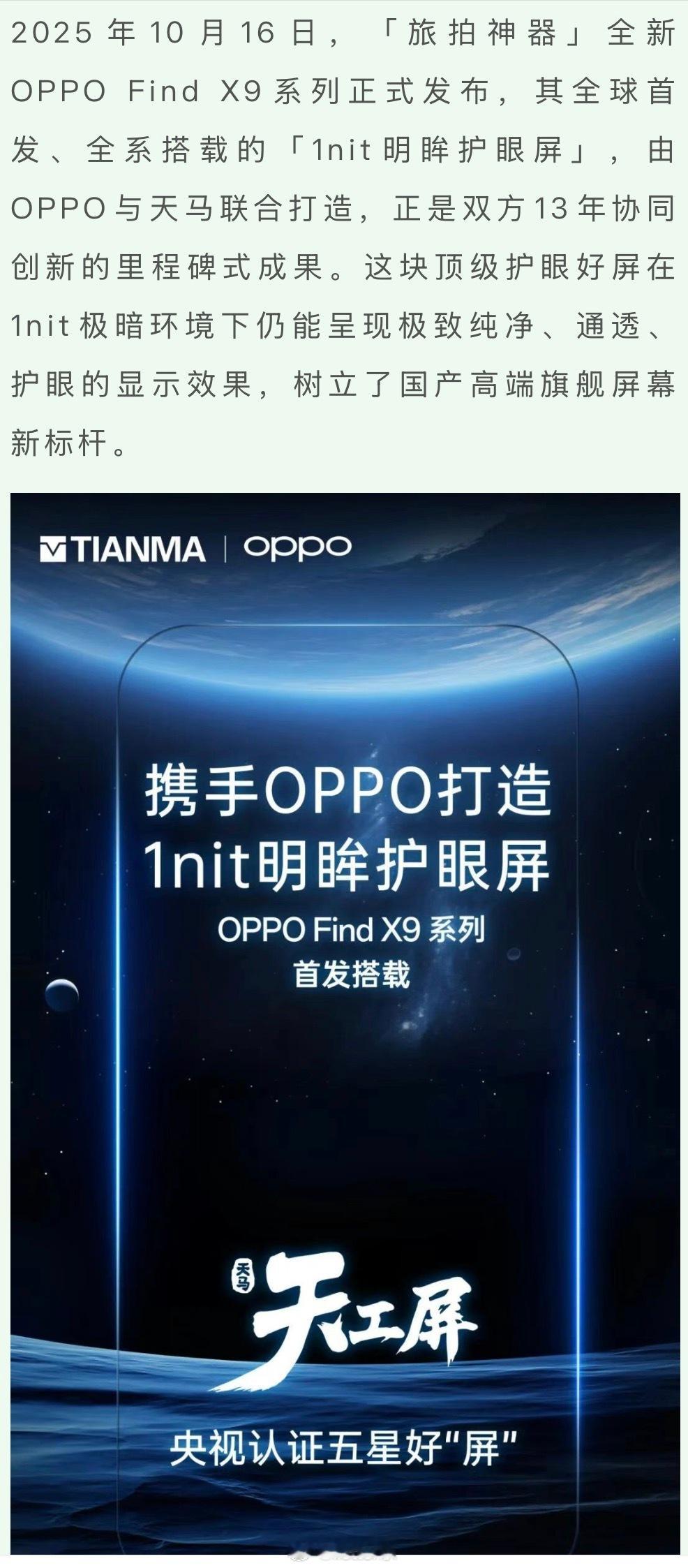说个小知识:昨天发布的全新OPPO Find X9用的是咱们国产好屏天马天工屏!